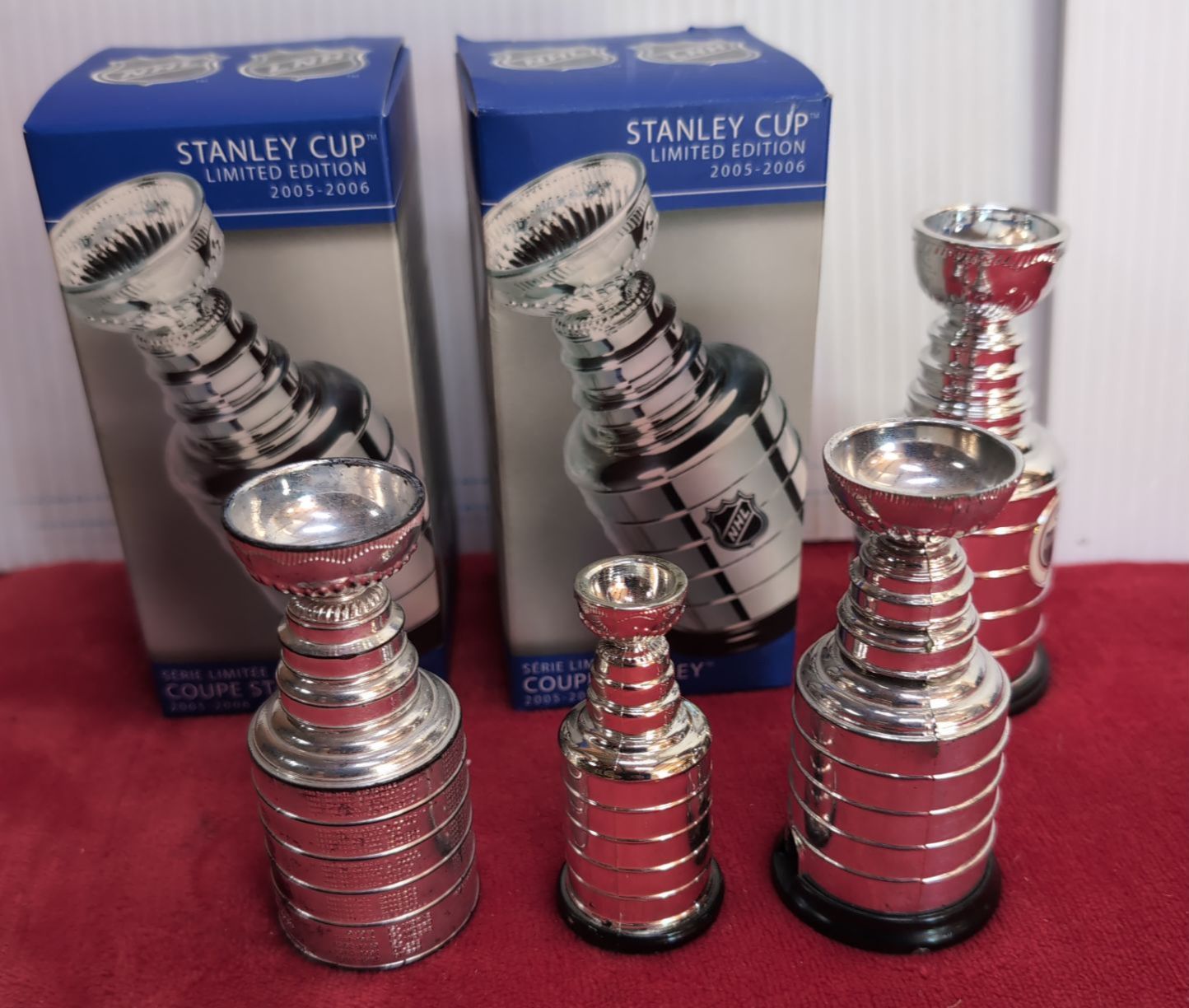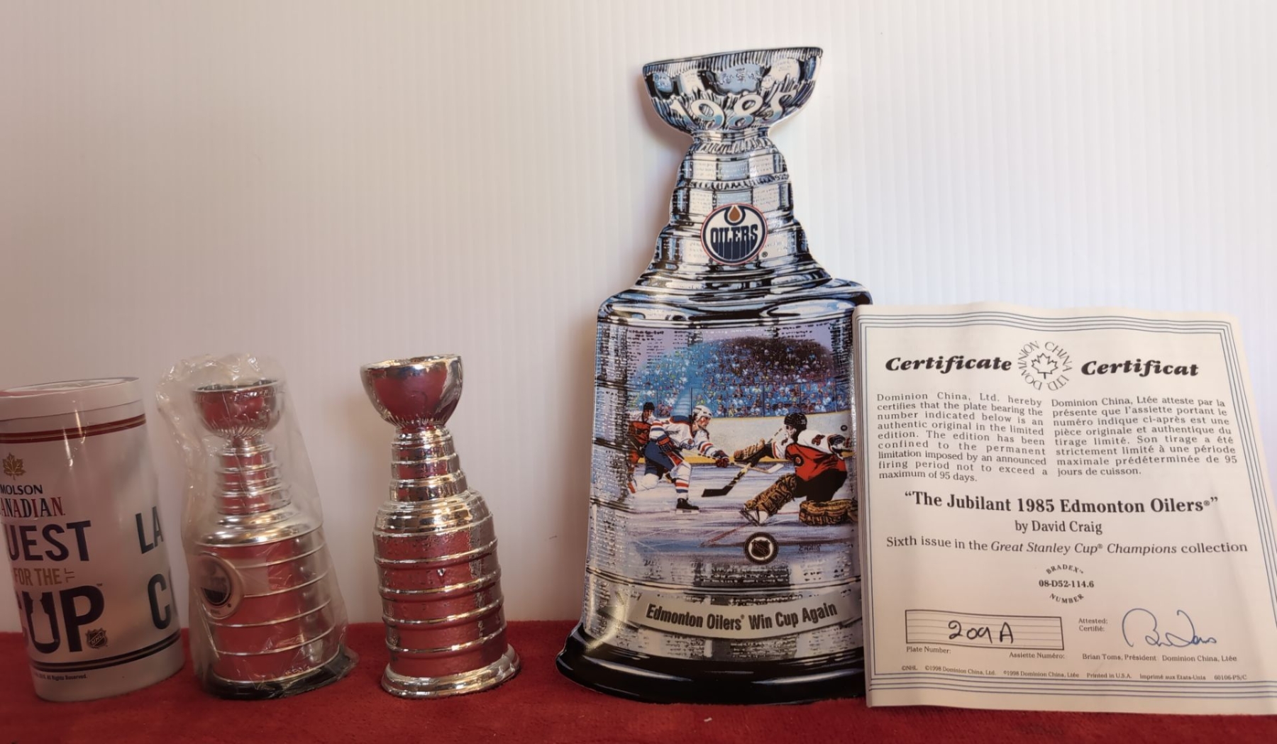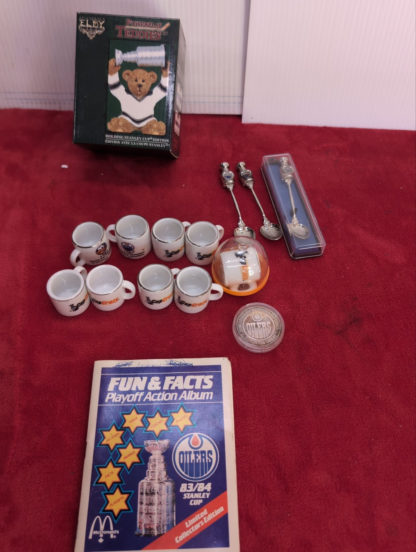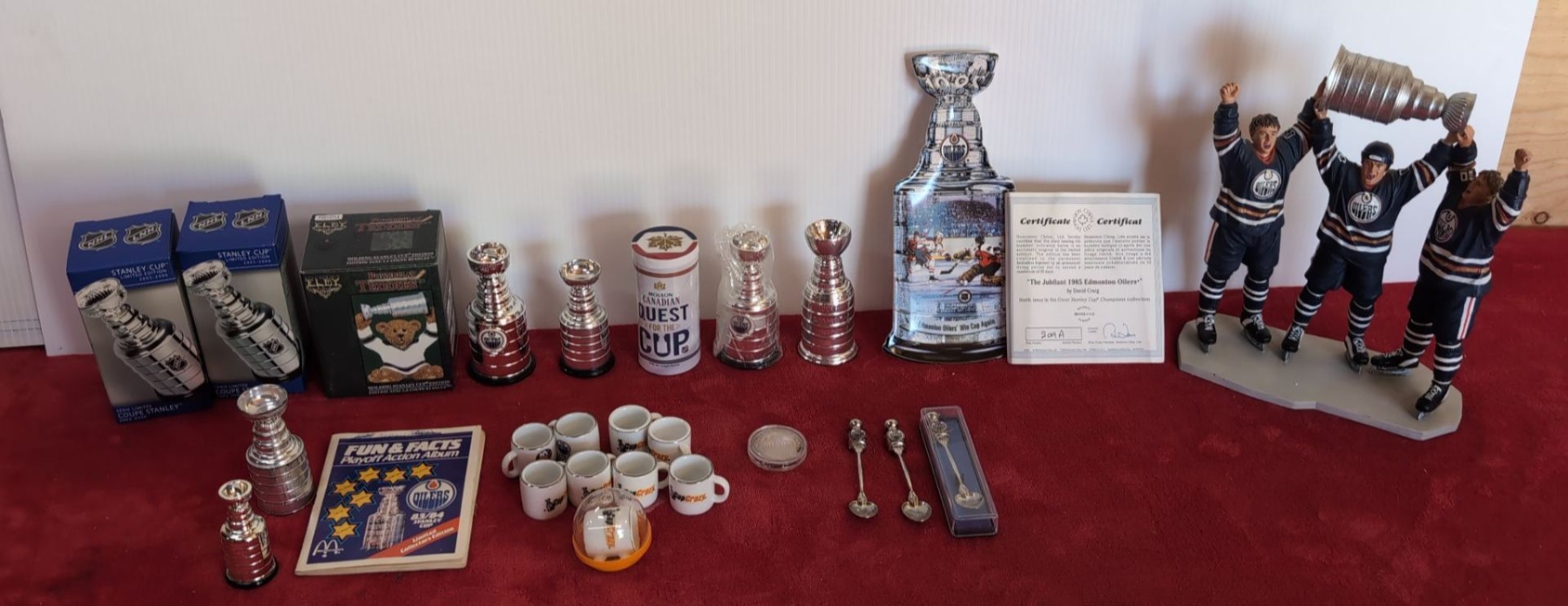 Oilers Statue with Stanley Cup, Variety of sizes of the Stanley Cups, Mini Mugs and Spoons
