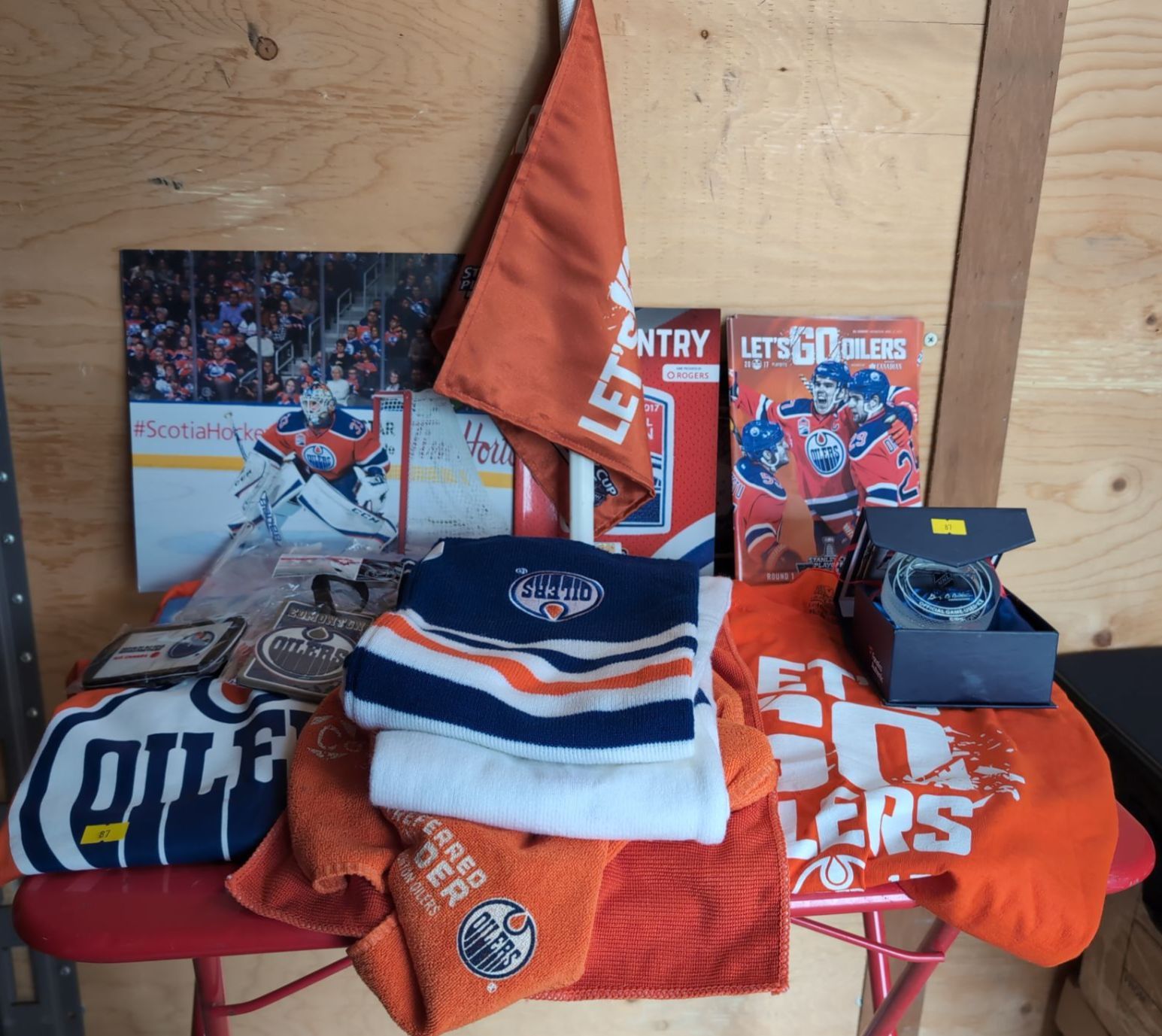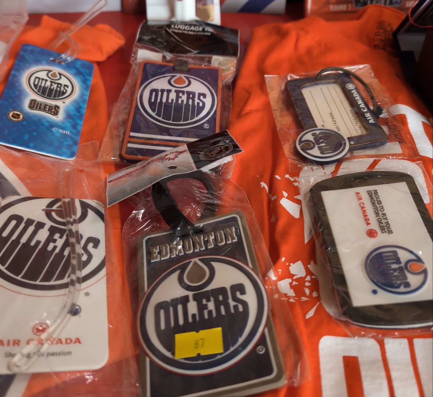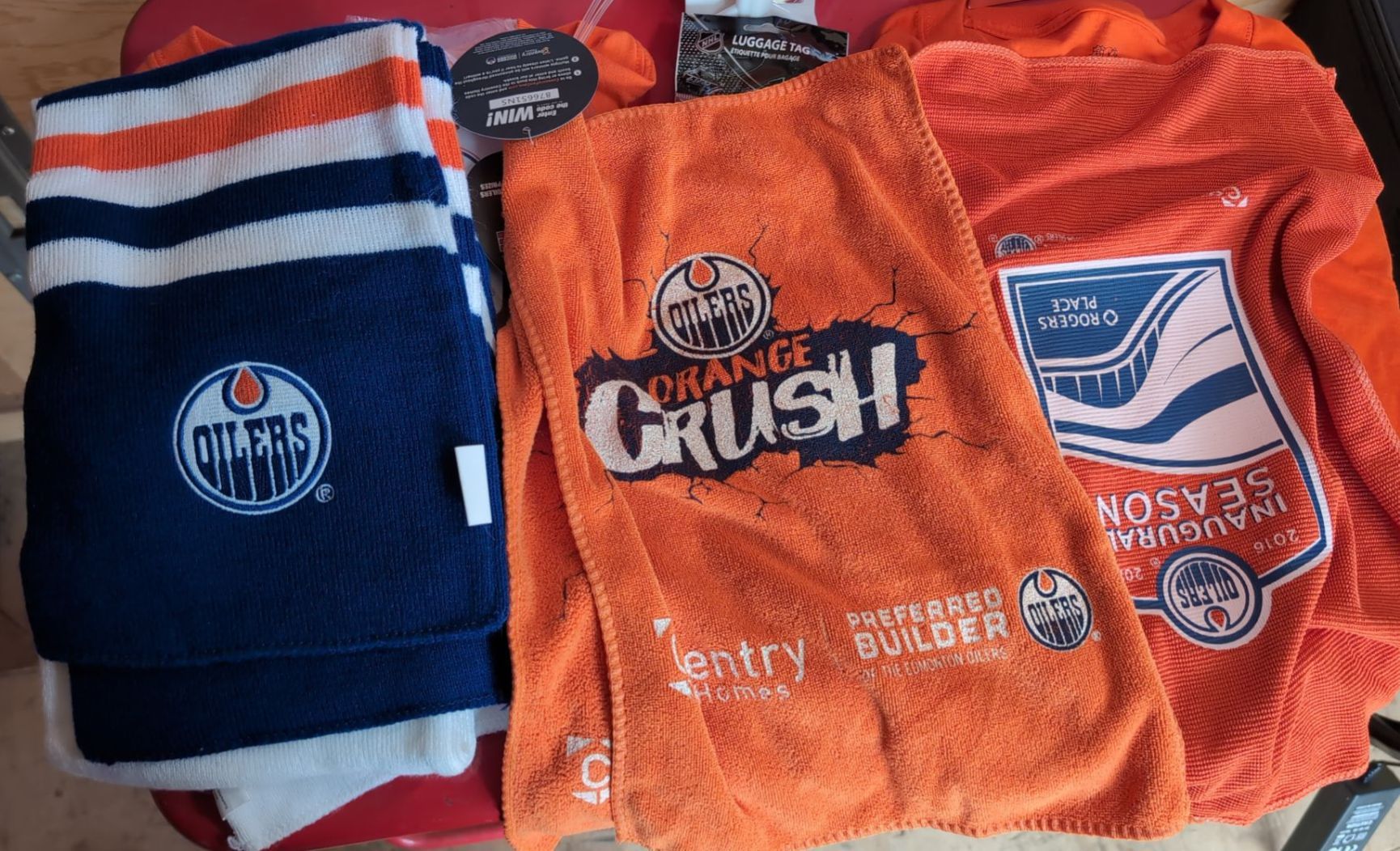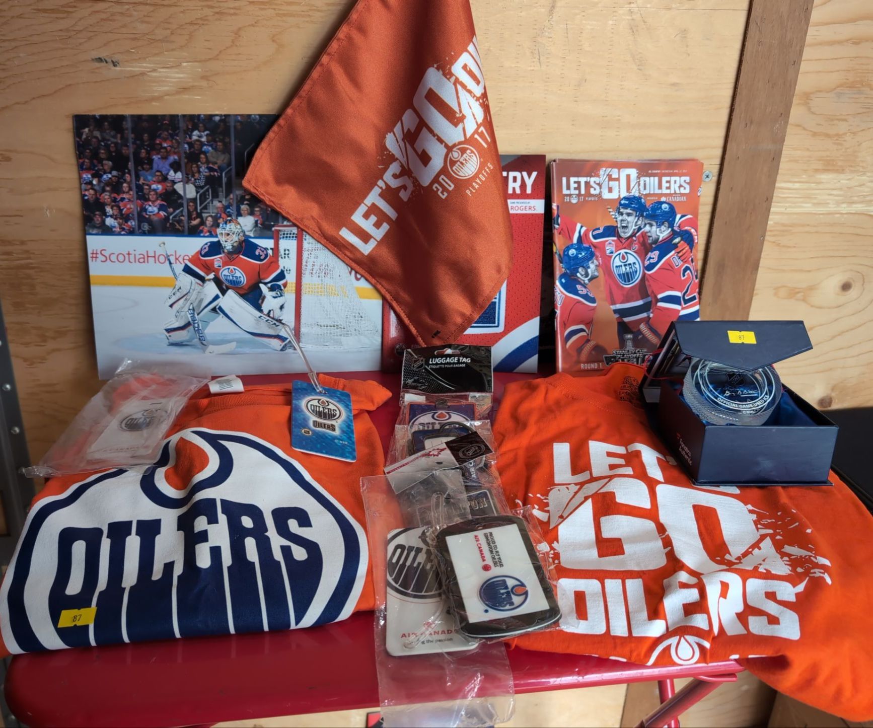 Oilers T-Shirts, Scarves, Luggage tags, Programs and Official game Used Ice