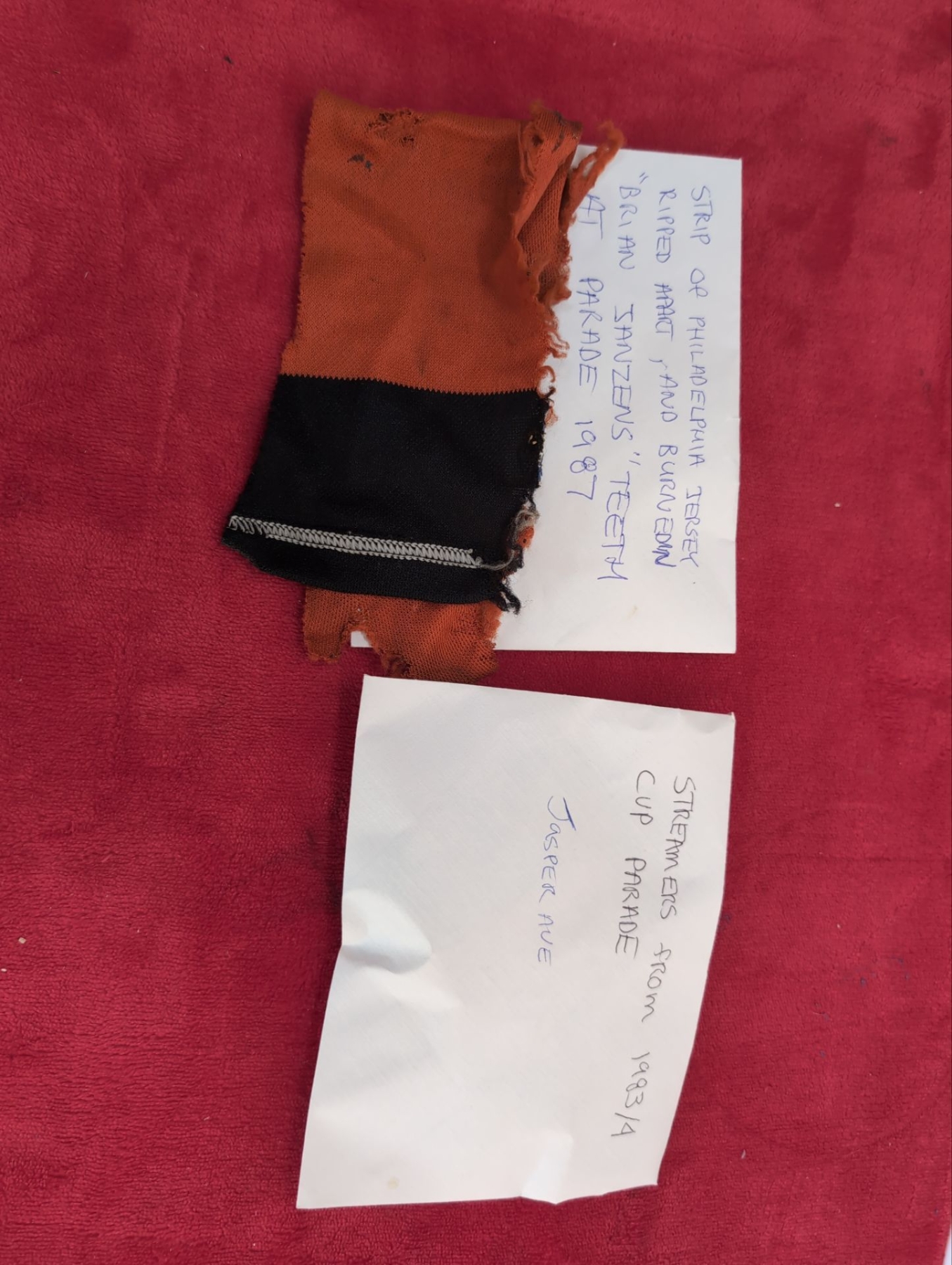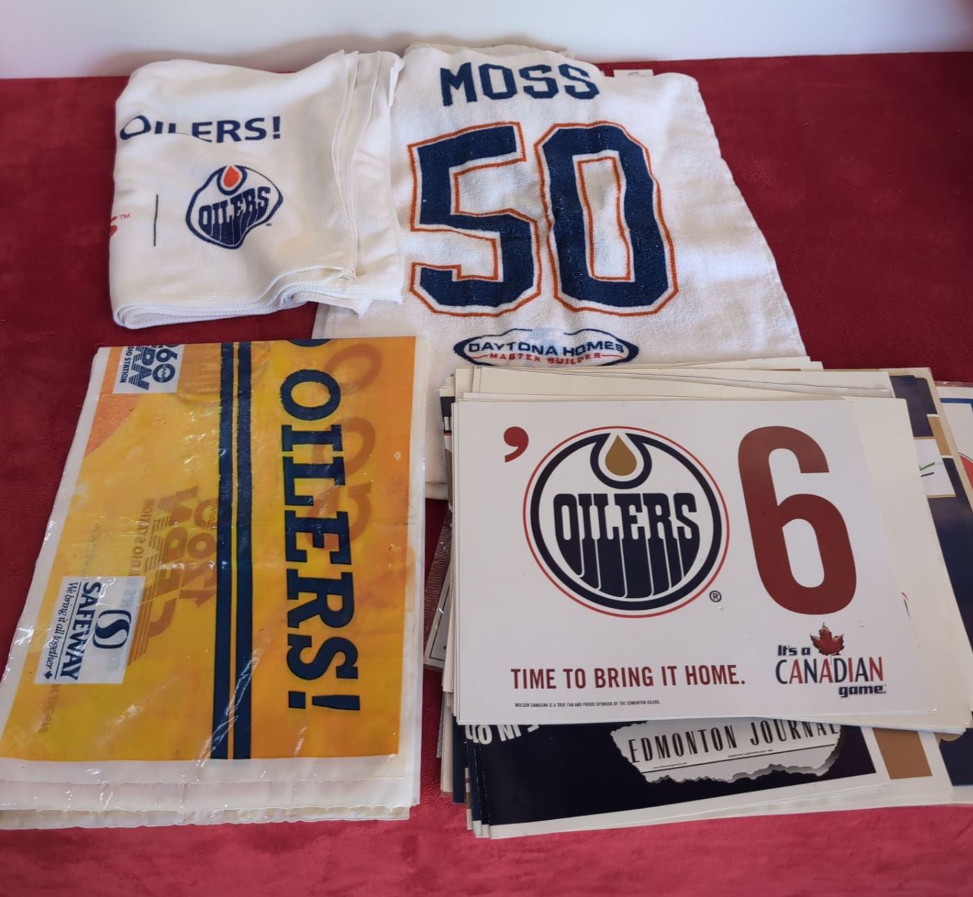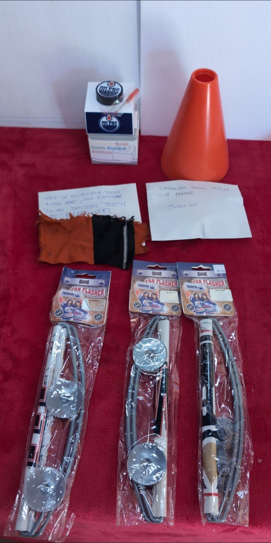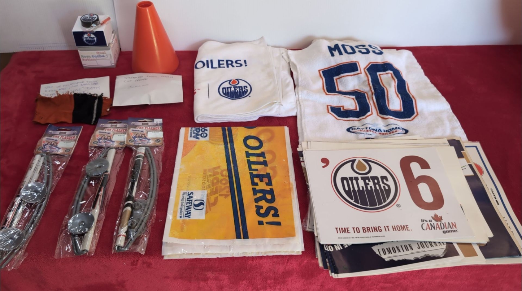 Oilers Towels, Various Signs, Fan Flasher Signs, Torn Piece of Flyers game worn Jersey