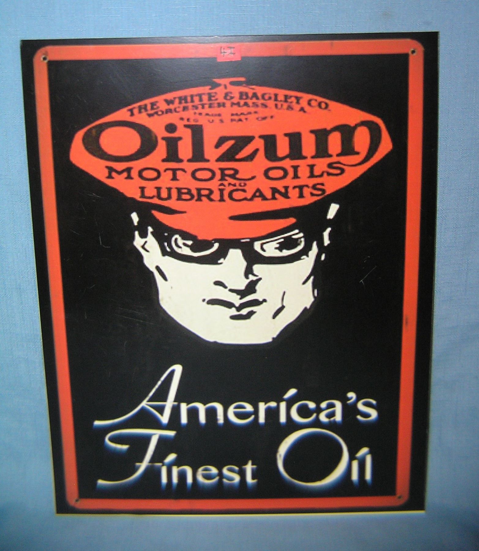 Oilzum America's Finest Oil retro style advertising sign printed on PVC hard board these signs are auctioned for there decorative and display purposes 12 inches by 16 inches est. value $50.00-$60.00