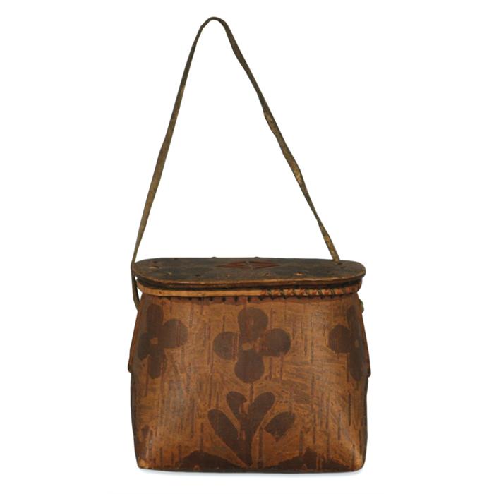 Ojibwa Birch Bark Container. 6" x 6" x 5". Ornate floral scratch work overall. C. 1860s. (est $500-750)