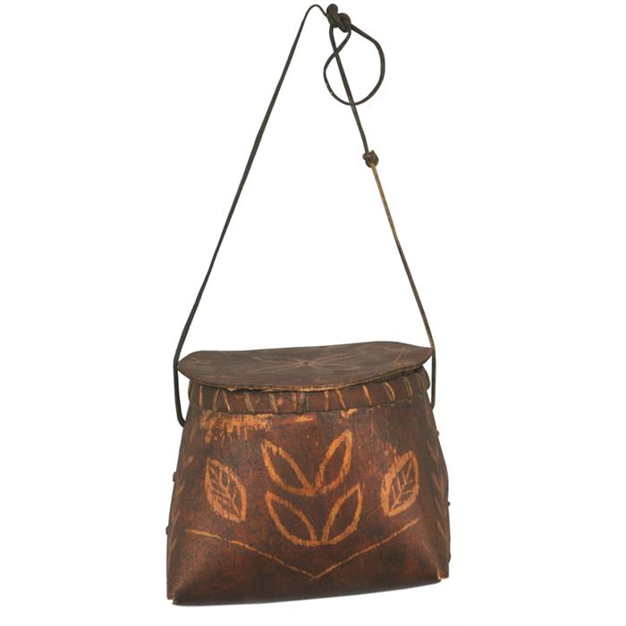 Chippewa Birch Bark Container. 7" x 9" x 8. Foliate scratch work overall. C. 1870s. (est $500-750)