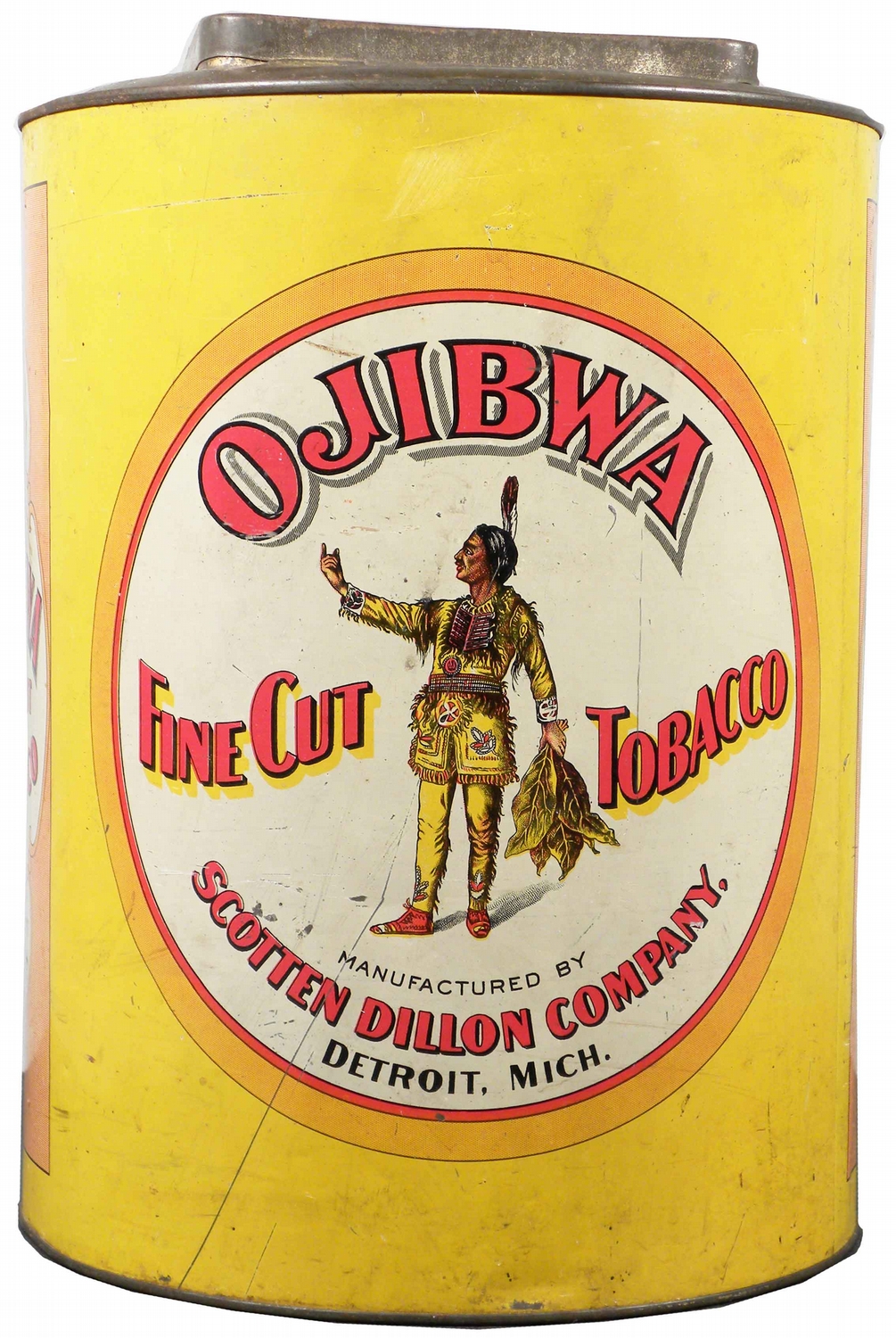 Ojibwa Fine Cut Tobacco Tin Store Bin. Very good condition. 8 inch diameter X 11 inches tall.
