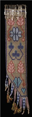 Ojibwa Knife Scabbard. 14" long. 3 ½” wide. Loom beadwork front with tabs and Germantown tassels on an early blue french velvet body over a bark liner. c. 1860s. Fine condition. (est $5,000-7,500).