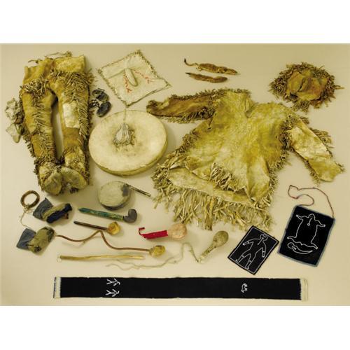 <B>Ojibwa Shaman's Ritual Material</B></I><BR>Circa 1880<BR><BR>This group contains an assortment of ceremonial regalia and associated artifacts including a hand drum, several rattles, pipes, charms, herbal medicines, weasel skins, and a series of native pen drawings. This collection was acquired in the 1920s by Alfred A. Allorecht from Johnny Martin at the Plains Ojibwa community of Swan Lake in southern Manitoba. This was during a period when the Canadian government suppressed native religious ceremonials, and when many elderly Indians discarded their ceremonial regalia. This collection consists of at least two groups of objects, each associated with a different religious cult. The heavily fringed costume and the mask with its long crooked nose is the typical outfit of a <I>Windigokan,</B></I> aka Cannibal, Clown, or Fools dancer. The <I>Windigokanek</B></I> was a society of masked dancers who represented cannibalistic ice giants, believed to live in the far north, and prominent in Plains Ojibwa folklore. The leaders of this cult were people who had dreamed of these giants or of thunderbirds, the latter referred to by the large crooked nose of their masks. By means of their dance this cult group was believed to exorcise the demons of disease, who used to invade the Indian camps in wintertime. The <I>Windigokan</B></I> also used their herbal medicines in curing sick people. The many small moccasins attached to this particular costume may refer to success in curing children. This costume, made of tanned and smoked hide, may pre-date the late nineteenth century, since when <I>Windigokan</B></I> costumes were commonly made of old pieces of canvas. Part of this group of objects is an additional long-nosed mask made of canvas, the drum with its cloth cover, the bulbous rattles, and perhaps some of the herbal medicines. The second group of artifacts consists of some beadwork decorated charms or scapulars, the wea