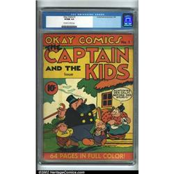 Okay Comics #1 (United Features Syndicate, 1940). This issue, featuring strip reprints of The Captain and the Kids, was published at the height of the superhero boom. It almost certainly had a hard time finding an audience, even considering the classic stories by Rudolf Dirks, and ran only one issue. As of this writing, this is the highest graded copy on CGC's population report. CGC VF/NM 9.0 Off-white to white pages. Overstreet 2001 NM 9.4 value = $375. Important notice: We expect to be auctioning lots at the rate of 200-250 per hour. Sometimes eBay Premier live bid software cannot keep up with that pace, so we strongly recommend that you place a realistic proxy bid now as insurance to avoid disappointment. Also please note that all Heritage/CAA lots purchased through eBay Premier carry a 20% Buyer's Premium.