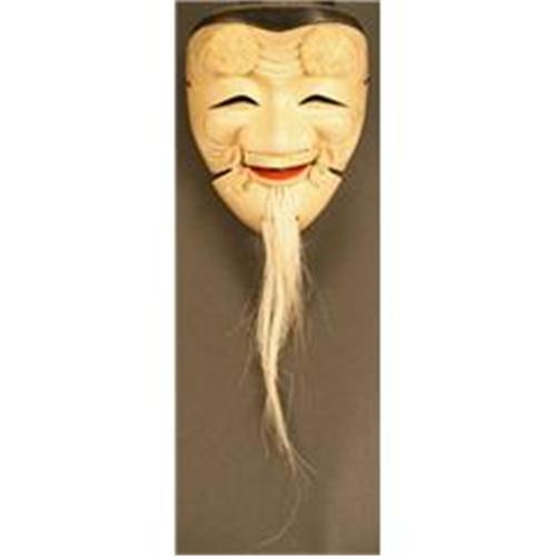 19th Century Meiji Period Japanese Noh Theater Mask of Okina, the Happy Old Man, portraying a happy man of wisdom and joy in many Noh dramas. This Noh mask is carved by Ko-Ikiu III from a long line of Noh mask carvers. It is finely lacquered over paloma wood. Signed with original case. This mask is in Perfect Condition. 7.5 inches tall (15 inches with beard) x 6 inches wide, 19cm tall (38cm with beard) x 15cm wide.