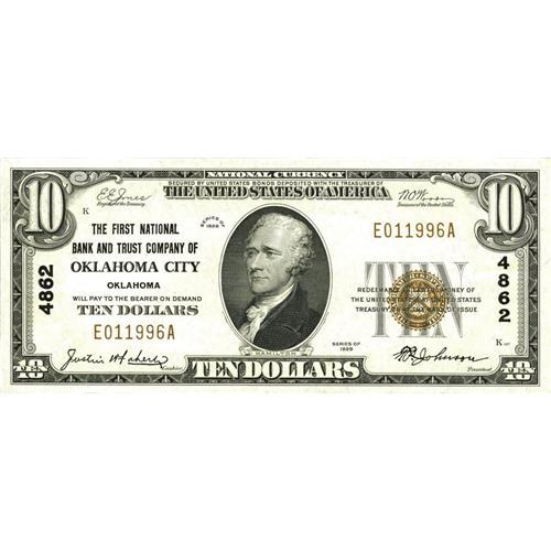 <B>Oklahoma City, OK</B></I> - $10 1929 Ty. 1 <B>The First NB & TC</B></I> Ch. # 4862<BR>This is a common enough bank, but few if any notes we've seen from here could equal this perfectly centered and fully embossed screamer. <B>Gem Crisp Uncirculated.</B></I>