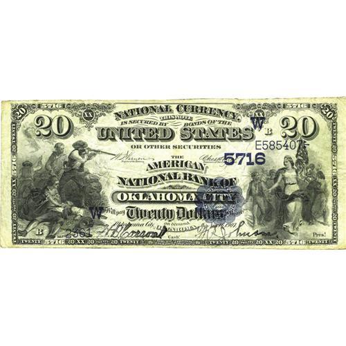 <B>Oklahoma City, OK</B></I> - $20 1882 Date Back Fr. 556 <B>The American NB</B></I> Ch. # (W)5716<BR>Large notes only from thos tougher Oklahoma City bank. This early example grades a problem free <B>Fine-Very Fine.</B></I>
