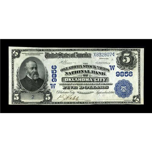 <B>Oklahoma City, OK</B></I> - $5 1902 Date Back Fr. 593 <B>The Oklahoma Stock Yards NB</B></I> Ch. # (W)9856<BR>This attractive example is one of a small group of serial number 1 and 2 notes from here which turned up many years ago. This piece is bright and crackling fresh, but the president's signature has faded. <B>Crisp Uncirculated.</B></I><BR><BR><b>Shipping:</b> Coin/Currency (<a target="_blank" href="http://www.heritageauctions.com/common/shipping.php">view shipping information</a>)