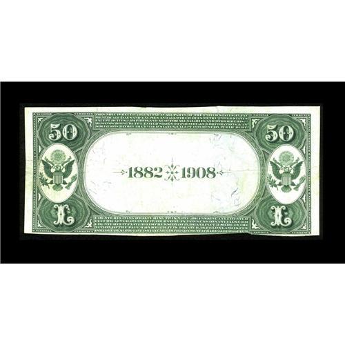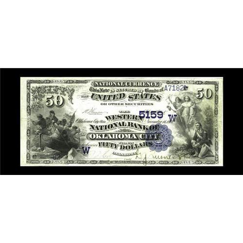 <B>Oklahoma City, OK</B></I> - $50 1882 Date Back Fr. 564 <B>The Western NB</B></I> Ch. # (W)5159<BR>This is a prohibitively rare type which was issued by only seven banks in the entire state. Somewhat coincidentally, that is the precise number of examples recorded in the census, with examples known from four of the seven issuers. This attractive piece is tied with one other for the title of finest known. It has been off the market for nearly fifteen years since our consignor obtained it in the the early 1990's. It was one of his favorite items and we are certain that it will fulfill the same role in the collection it now enters. <B>Very Fine,</B></I> with a bit of tight trim at the bottom mentioned solely for the sake of full cataloguing accuracy.