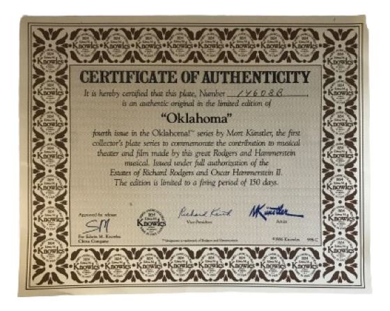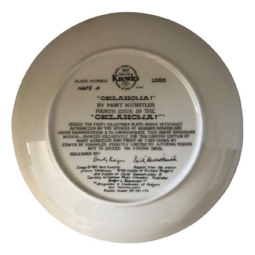 "Oklahoma", the fourth issue in the "Oklahoma" collector's plate series to commemorate this beloved musical. Endorsed by the estates of Richard Rodgers and Oscar Hammerstein II. Painted exclusively for this Limited Edition by Mort Kunstler and fired on fine China by Edwin M. Knowles. Plate number 14608 b.(10"x10"). Certificate of Authenticity