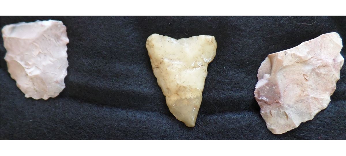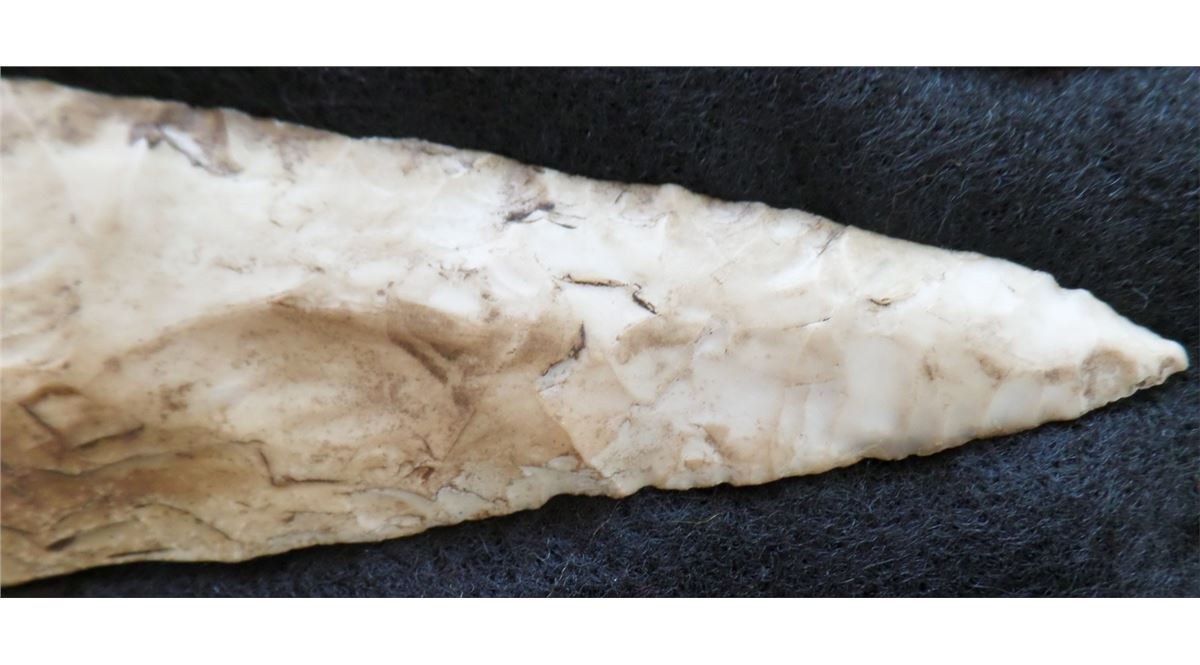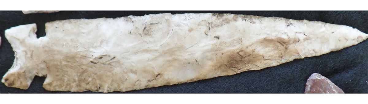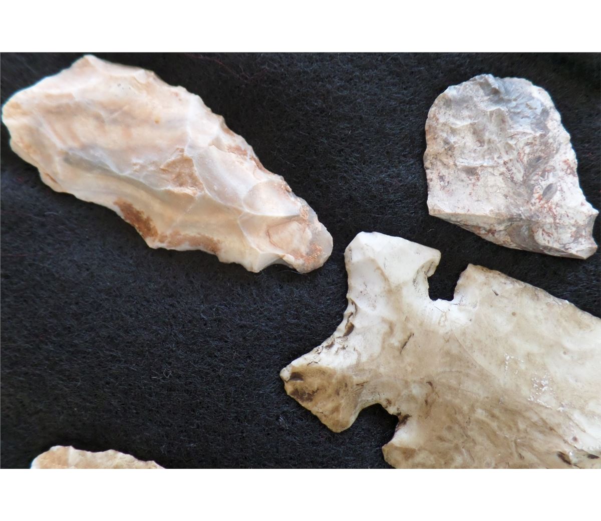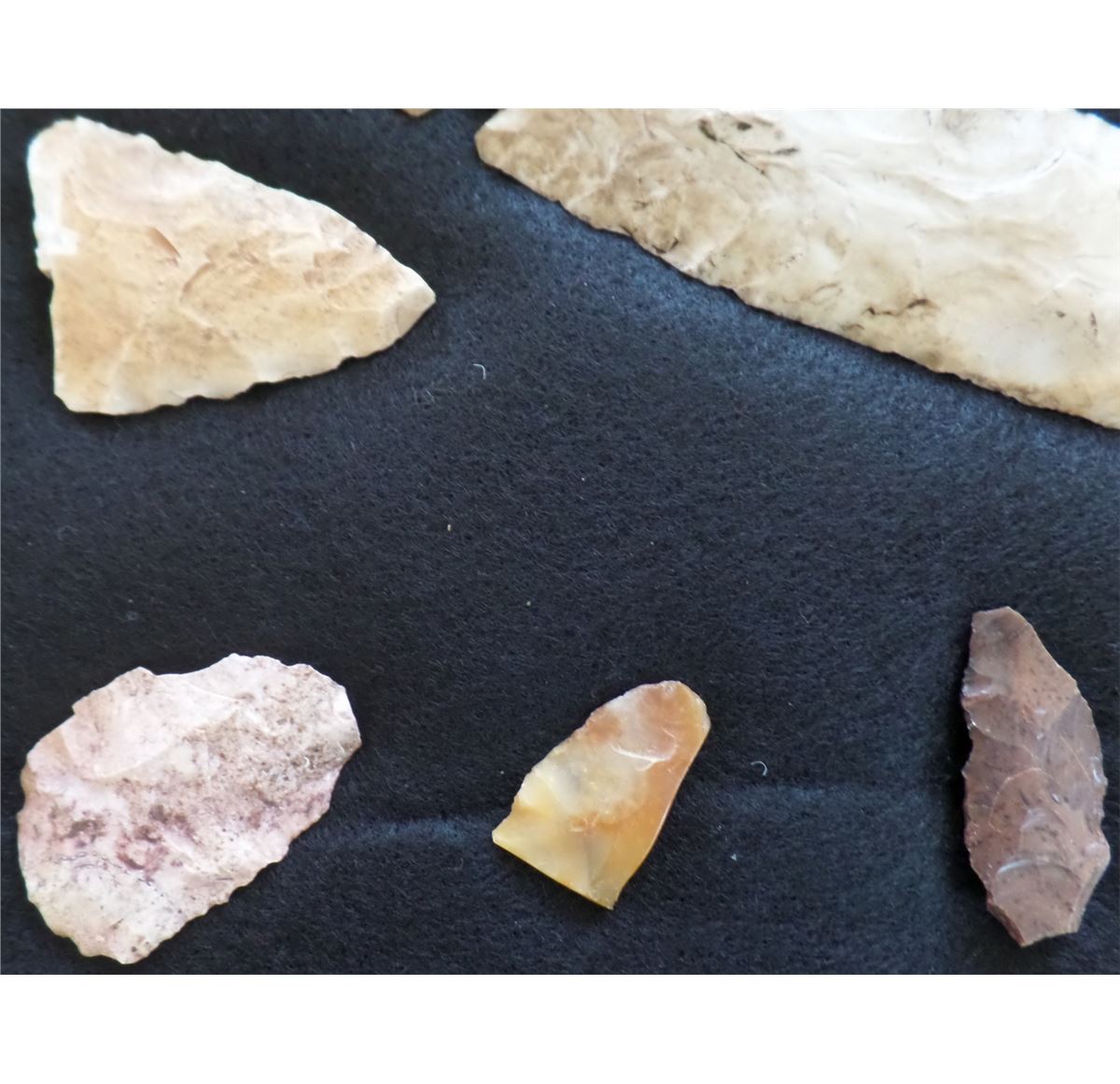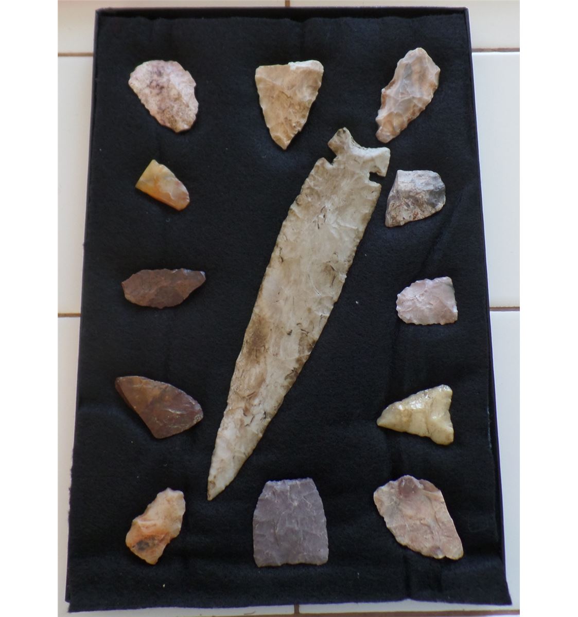 Oklahoma Flint Collection w/8" Spearhead. Pre-historic. Made of flint and chert. Items measures 1" to 8", mostly 1" to 2". Possibly Comanche. Frame not Included. 13 pieces in all. Condition: Most are damaged, spearhead in nice shape. Shipping: $20.