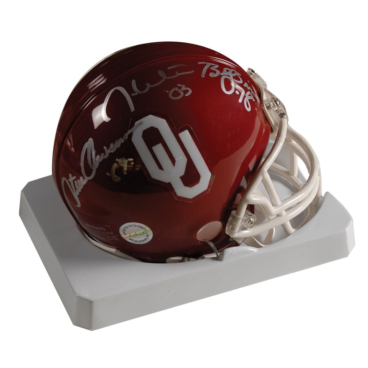 Official Riddell Oklahoma Sooners football mini-helmet signed in silver ink on the side by Heisman trophy winners Steve Owens, Billy Sims, and Jason White. In fine condition.