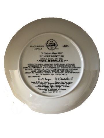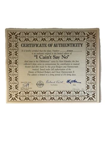 "I Can't Say No", the third issue in the "Oklahoma" collector's plate series to commemorate this beloved musical. Endorsed by the estates of Richard Rodgers and Oscar Hammerstein II. Painted exclusively for this Limited Edition by Mort Kunstler and fired on fine China by Edwin M. Knowles. Plate number 3743 a. (10"x10") Certificate of Authenticity included.