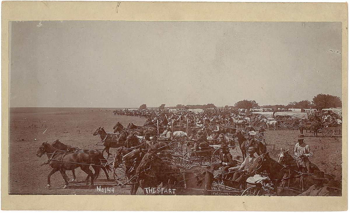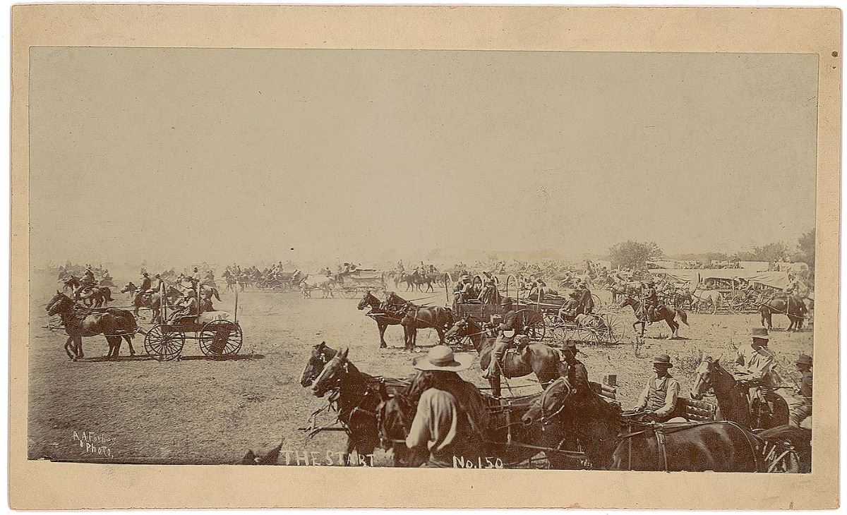 Two original circa 1889 mounted photographs by A. A. Forbes depicting the moment the Oklahoma land rush began, each approximately 7.5 x 4, labeled within the original negatives, “No. 149, The Start” and “No. 150, The Start.” The first shows would-be settlers awaiting the land run, which commenced at high noon on April 22, 1889, and the second image shows them within moments of taking off. In overall fine condition.