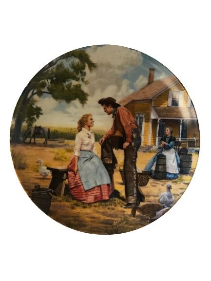 "Oh What A Beautiful Morning" is the first issue in the "Oklahoma" collector's plate series to commemorate this beloved musical. Endorsed by the estates of Richard Rodgers and Oscar Hammerstein II. Painted exclusively for this Limited Edition by Mort Kunstler and fired on fine China by Edwin M. Knowles. Plate number 19074 D. Certificate of Authenticity included (10"x10").