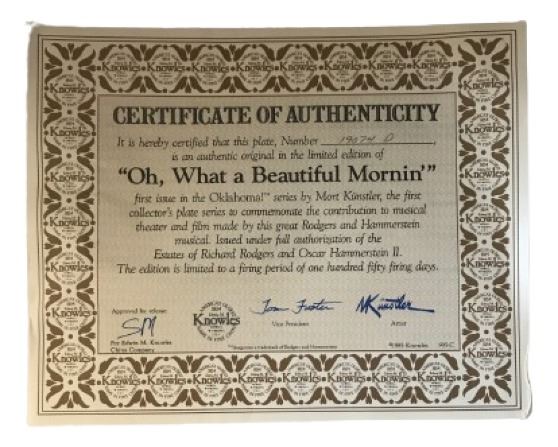 "Oh What A Beautiful Morning" is the first issue in the "Oklahoma" collector's plate series to commemorate this beloved musical. Endorsed by the estates of Richard Rodgers and Oscar Hammerstein II. Painted exclusively for this Limited Edition by Mort Kunstler and fired on fine China by Edwin M. Knowles. Plate number 19074 D. Certificate of Authenticity included (10"x10").