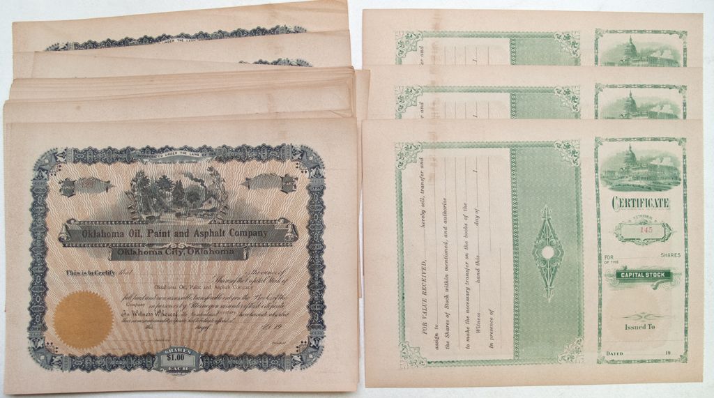 Oklahoma Oil, Paint and Asphalt Company unissued stock certificates Approximately 60. Blank seal - $1.oo share each.