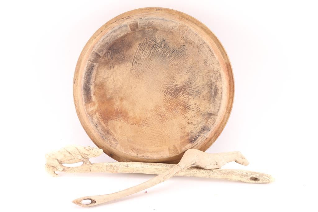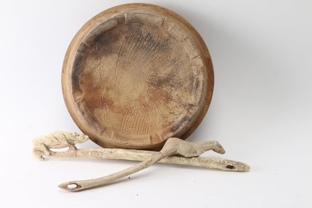 Pottery stamped "Native" with Indian Chief profile on bottom. Measures 10" around and 1 3/4" high. The two carved wood tools measure 11" and 14".
