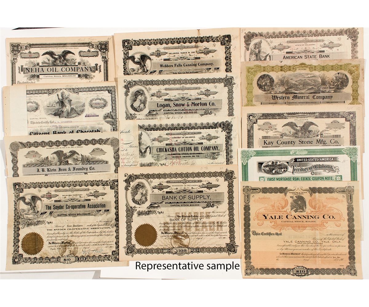c1898 Incredible lot of over 30 documents, certificates, bank notes and Indian Territory notes. These have been collected from the late 1890`s through the early 1900`s. The stock certificates alone number 18 issued and unissued notes, ranging from mortgage bank notes to the Farmers and Miners Bank to the Duncan Cotton Oil Co. There is a group of 7 issued and 2 unissued certificates from the Citizens Bank of Checotah, complete with gold seal and very nice vignettes on the face, the majority sold to one A.H. Livingston. There is an unissued business license for the city of Chickasha, an Allotment Deed from the Cherokee Nation to Amanda Holder. The remainder of the ephemera consist of a Treasurer`s Check from Logan County, O.T. 2 Township Warrant cards from Union, a First Mortgage Bond note (#10860) for $1500.00, and finally a sheaf of First National Bank checks from Tishomingo, OK. All documents range from good to excellent condition. A very eclectic and historic lot. - HKA#65266