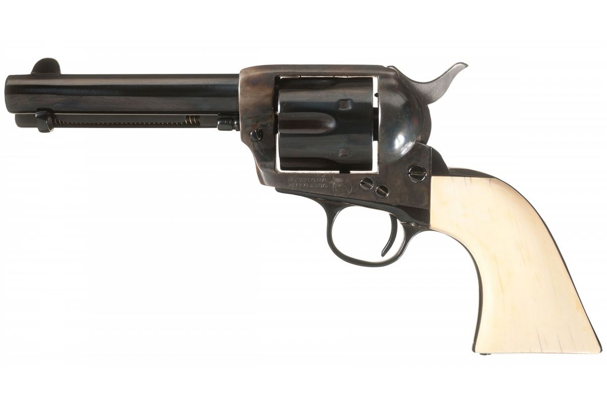 According to the included factory letter, this revolver was shipped the Turner Hardware Company of Muskogee, Oklahoma Territory on 1 November 1903. Before Statehood in 1907, the Oklahoma Territory was the proposed site for the State of Sequoyah, a hypothetical Indian State that would have used Muskogee as it's capital. Fixed sights with the 2-line, three date patent markings on the left side of the frame next to the Rampant Colt, blue trigger and hammer and smooth ivory grips. The back strap is inscribed "James J Wheat", identified by the consignor as Loving County rancher and spur collector Jimmy Wheat, who donated his large volume of top quality spurs to the National Ranching Hertiage Center at Texas Tech University in 1985. The collection included 920 spur pairs and singles and 119 bits. Wheat oversaw a 200 section ranch were approximately 300 oil wells were producing. He was known for driving Rolls Royce and Mercedes-Benz automobiles to move his heard of 300 cattle across his ranch.