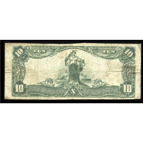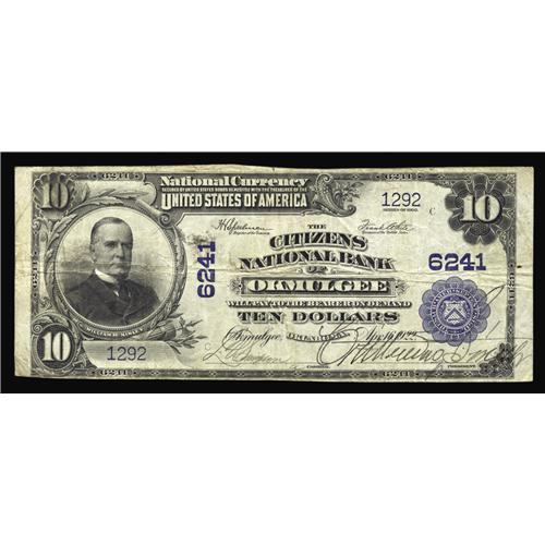 <B>Okmulgee, OK</B></I> - $10 1902 Plain Back Fr. 635 <B>The Citizens NB</B></I> Ch. # 6241<BR>An attractive large example from this none too common Okmulgee bank. Pleasing <B>Fine+,</B></I> with pen signatures, the Vice President's a true vanity effort.