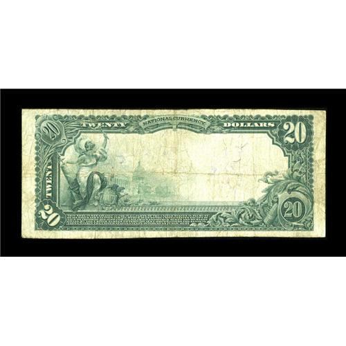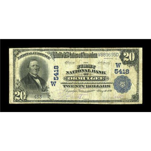 <B>Okmulgee, OK</B></I> - $20 1902 Plain Back Fr. 659 <B>The First NB</B></I> Ch. # (W)5418<BR>This was the first of no fewer than seven banks chartered in this small county seat community. Like its siblings, it had a relatively short and undistinguished life, with this institution failing to survive beyond 1924. Just five notes are known from here, with this one of that limited number. Evenly circulated <B>About Fine.</B></I><BR><BR><b>Shipping:</b> Coins & Currency (<a target="_blank" href="http://www.heritageauctions.com/common/shipping.php">view shipping information</a>)