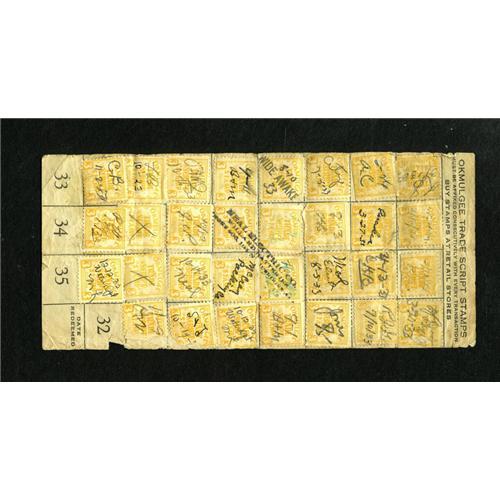 <B>Okmulgee, OK- Trade Script</B></I> $1 Jan. 1, 1934<BR>This piece of Trade Script was intended to encourage trade within the city limits. Purchases with different merchants earned stamps worth 3 each. Once 35 stamps were earned, this certificate could be redeemed for $1 at the office of the Commissioner of Finance. The dates and locations of the stamps were written on each stamp as they were earned, creating a trail of activity for this owner. Some of the places that this holder redeemed stamps between 3/13/33 and 12/12/33 included, the City, McCray Packing Co., the Water Dept., Wide Awake, Quaker, Neal Electric, and many others. The paper is a bit rough around the edges and retains 31 of the 35 stamps.<BR><BR><b>Shipping:</b> Coins & Currency (<a target="_blank" href="http://www.heritageauctions.com/common/shipping.php">view shipping information</a>)