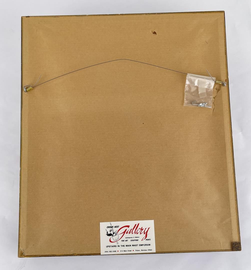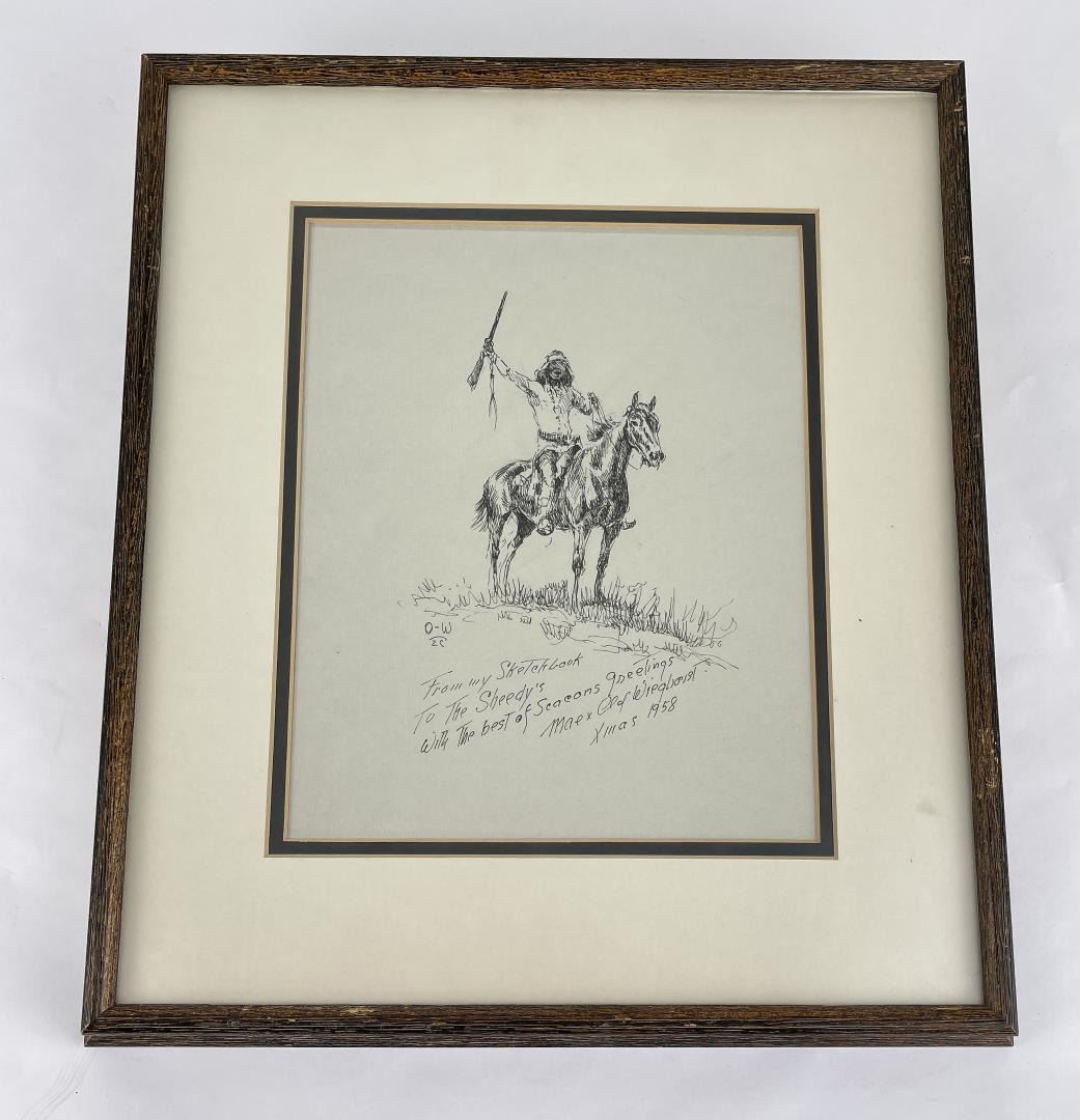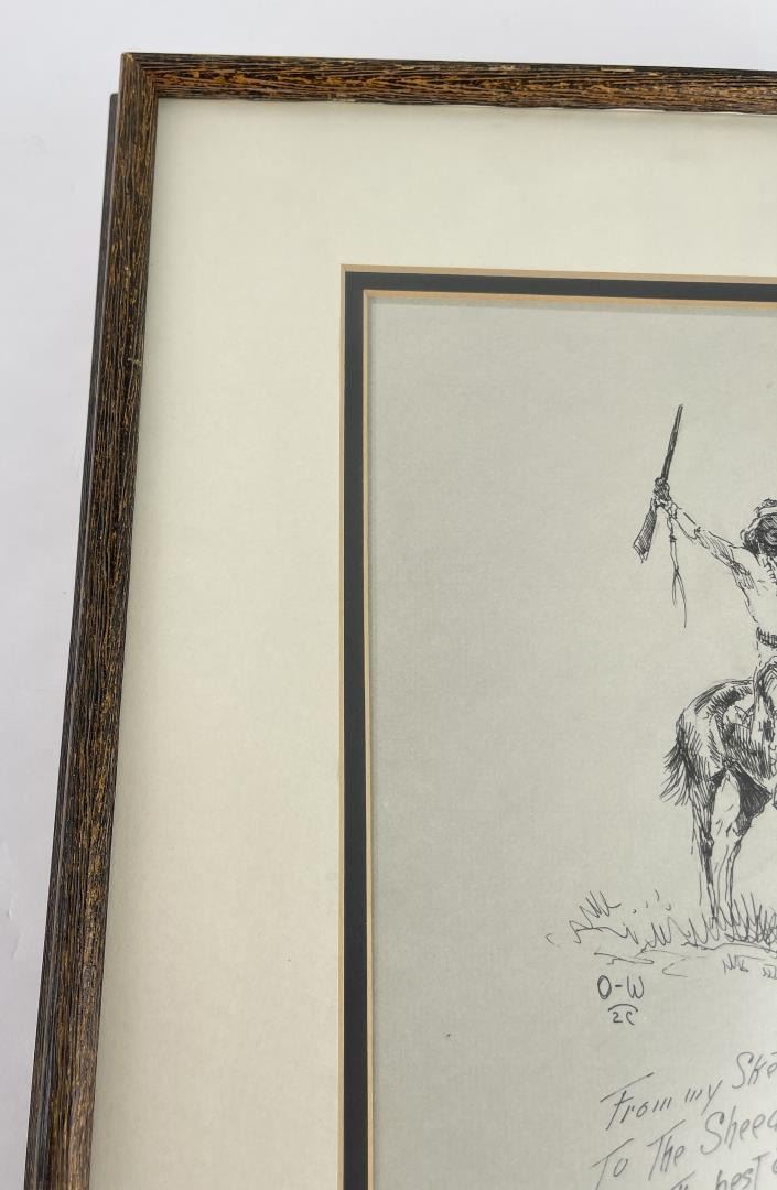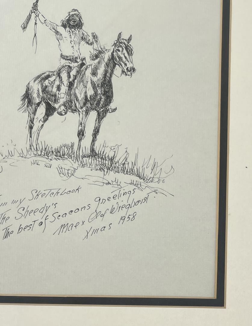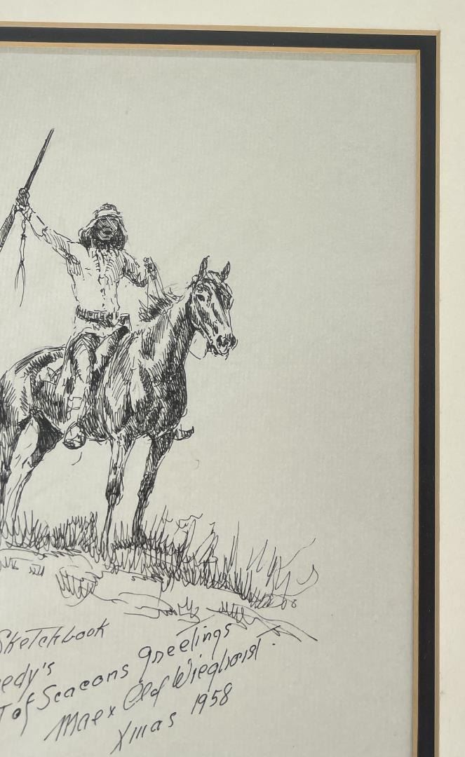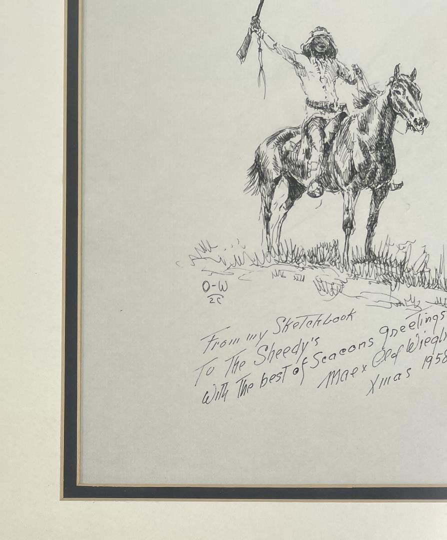 Inscribed: From my Sketchbook to the Sheedy's with the best of Seasons Greetings Olaf Wieghorst Xmas 1958. 14" by 16" framed. Born in Viborg, Denmark, Olaf Wieghorst was a child acrobatic performer from the age of nine when he began appearances at Tivoli Theater in Copenhagen and later toured Europe. He also learned horseback riding working on a stock farm, and horses became a major focus of his admiration and later his painting. In 1918, he arrived in the United States, having worked as a cabin boy on a steamer. He served in the 5th U.S. Cavalry on the Mexican border in the days of Pancho Villa. He later recalled a favorite horse from that period and said that riding through El Paso in 1921, the horse fell on his ankle and broke it. The outfit was heading to Douglas, Arizona, and not wanting to be left behind with his injury, he stayed on the horse which carried him all the way through the New Mexico desert on one of the hottest days of the year. The horse died during the night, having expended all his energy on saving Wieghorst. He later wrote that when the Cavalry discarded the use of horses, "they took the soul out of that great branch of the service" ("Widening Horizons"). He wandered extensively through the West sometimes on horseback, finding work in Arizona and New Mexico as a cowboy. Then he went to New York and served as a mounted policeman until 1944, spending most of his time on a horse named Rhombo patrolling the Central Park bridle paths and saving many people injury from runaway horses. He began painting in his spare time, and he was successful enough that his work was represented by the Grand Central Art Galleries of the Biltmore Hotel. In 1944, he settled in El Cajon, California. His paintings include cowboys, horses, and Indians in landscape, but there is little if any collectible art of his done during his early days in the West. His primary output came after his return to California when he began painting cowboys and horses extensively. He did numerous horse portraits, spending time on ranches studying their unique personalities. He painted celebrity horses including Roy Rogers' Trigger, Gene Autry's Champion and Tom Morgan's stallion. He was a large, powerful, handsome, and very personable man.