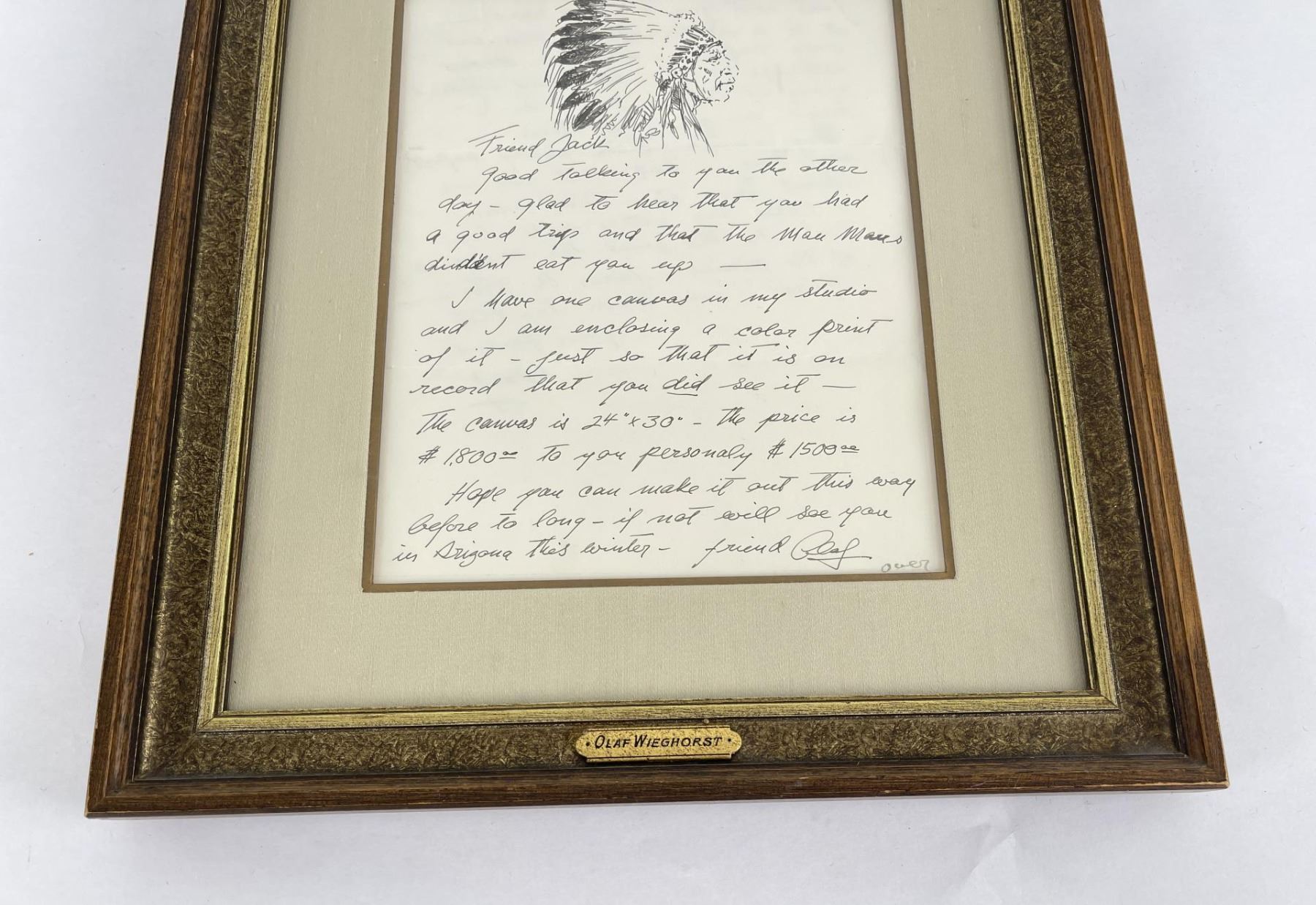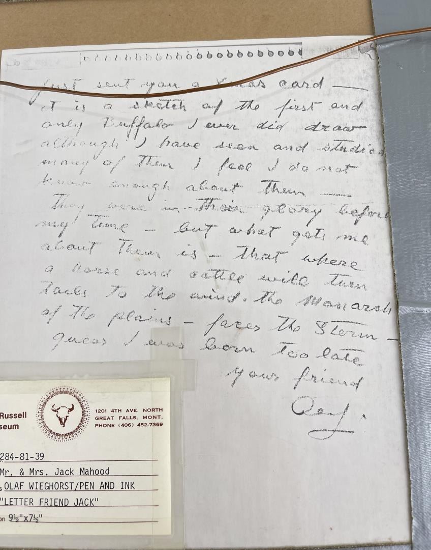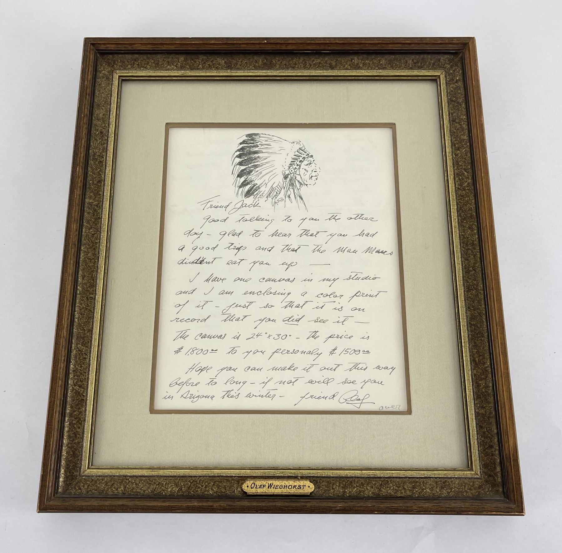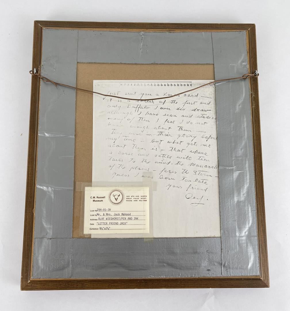 Pen and Ink. 13 3/8" by 15 3/8" framed. Provenance: Ex CM Russell Art Museum on loan by Jack Mahood Great Falls Montana. Born in Viborg, Denmark, Olaf Wieghorst was a child acrobatic performer from the age of nine when he began appearances at Tivoli Theater in Copenhagen and later toured Europe. He also learned horseback riding working on a stock farm, and horses became a major focus of his admiration and later his painting. In 1918, he arrived in the United States, having worked as a cabin boy on a steamer. He served in the 5th U.S. Cavalry on the Mexican border in the days of Pancho Villa. He later recalled a favorite horse from that period and said that riding through El Paso in 1921, the horse fell on his ankle and broke it. The outfit was heading to Douglas, Arizona, and not wanting to be left behind with his injury, he stayed on the horse which carried him all the way through the New Mexico desert on one of the hottest days of the year. The horse died during the night, having expended all his energy on saving Wieghorst. He later wrote that when the Cavalry discarded the use of horses, "they took the soul out of that great branch of the service" ("Widening Horizons"). He wandered extensively through the West sometimes on horseback, finding work in Arizona and New Mexico as a cowboy. Then he went to New York and served as a mounted policeman until 1944, spending most of his time on a horse named Rhombo patrolling the Central Park bridle paths and saving many people injury from runaway horses. He began painting in his spare time, and he was successful enough that his work was represented by the Grand Central Art Galleries of the Biltmore Hotel. In 1944, he settled in El Cajon, California. His paintings include cowboys, horses, and Indians in landscape, but there is little if any collectible art of his done during his early days in the West. His primary output came after his return to California when he began painting cowboys and horses extensively. He did numerous horse portraits, spending time on ranches studying their unique personalities. He painted celebrity horses including Roy Rogers' Trigger, Gene Autry's Champion and Tom Morgan's stallion. He was a large, powerful, handsome, and very personable man.