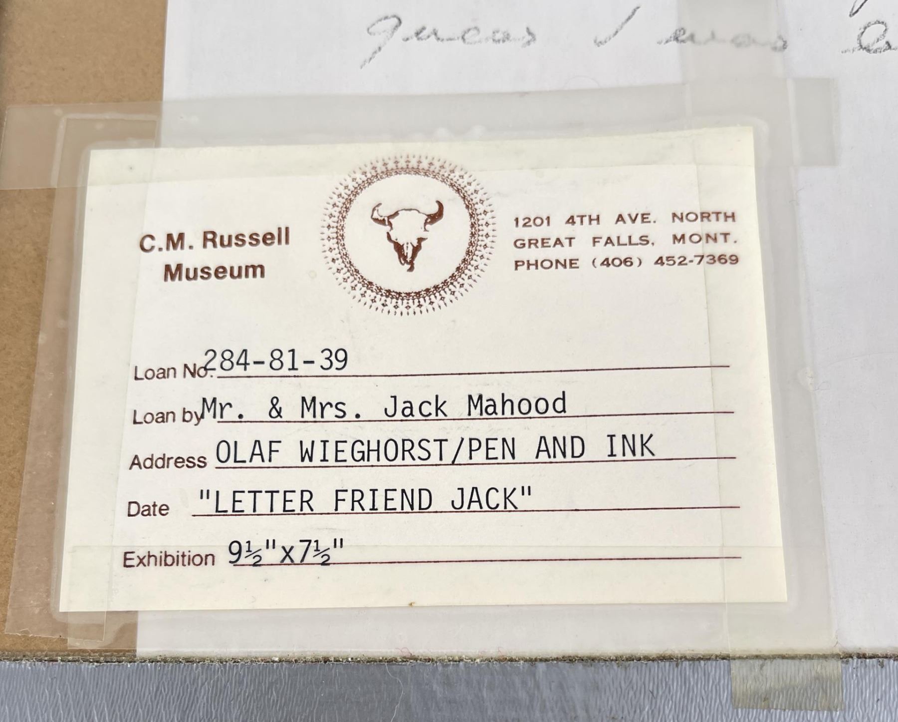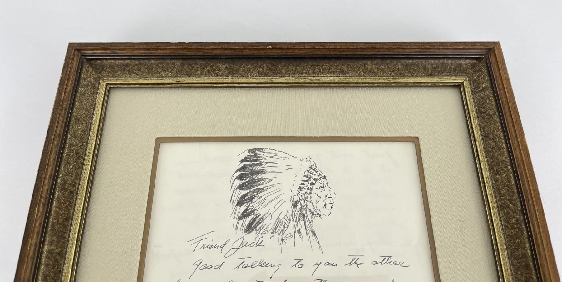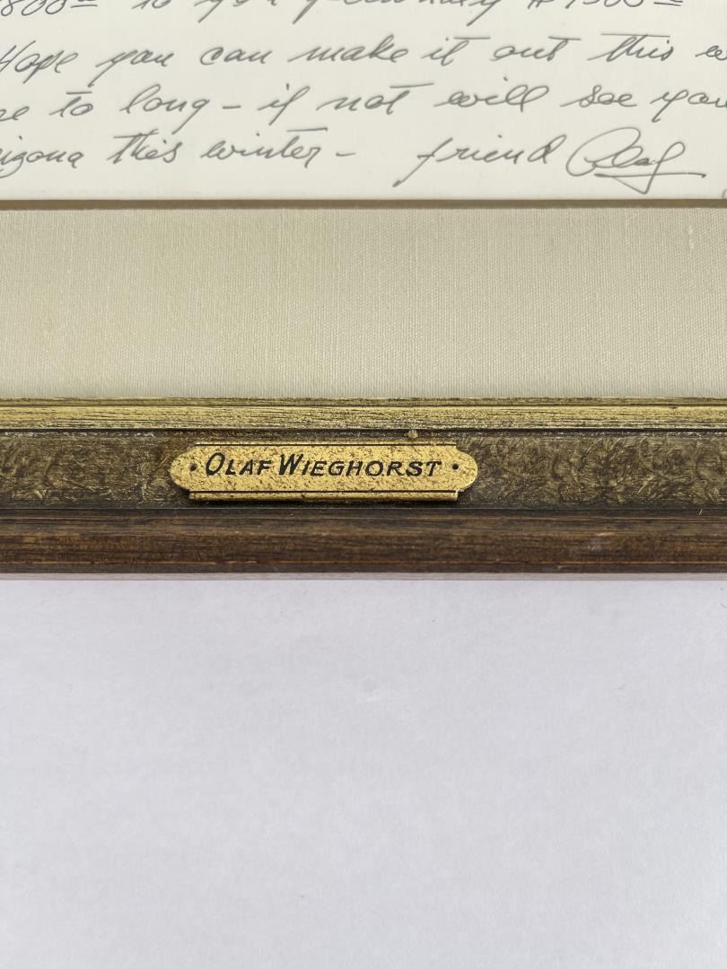 Pen and Ink. 13 3/8" by 15 3/8" framed. Provenance: Ex CM Russell Art Museum on loan by Jack Mahood Great Falls Montana. Born in Viborg, Denmark, Olaf Wieghorst was a child acrobatic performer from the age of nine when he began appearances at Tivoli Theater in Copenhagen and later toured Europe. He also learned horseback riding working on a stock farm, and horses became a major focus of his admiration and later his painting. In 1918, he arrived in the United States, having worked as a cabin boy on a steamer. He served in the 5th U.S. Cavalry on the Mexican border in the days of Pancho Villa. He later recalled a favorite horse from that period and said that riding through El Paso in 1921, the horse fell on his ankle and broke it. The outfit was heading to Douglas, Arizona, and not wanting to be left behind with his injury, he stayed on the horse which carried him all the way through the New Mexico desert on one of the hottest days of the year. The horse died during the night, having expended all his energy on saving Wieghorst. He later wrote that when the Cavalry discarded the use of horses, "they took the soul out of that great branch of the service" ("Widening Horizons"). He wandered extensively through the West sometimes on horseback, finding work in Arizona and New Mexico as a cowboy. Then he went to New York and served as a mounted policeman until 1944, spending most of his time on a horse named Rhombo patrolling the Central Park bridle paths and saving many people injury from runaway horses. He began painting in his spare time, and he was successful enough that his work was represented by the Grand Central Art Galleries of the Biltmore Hotel. In 1944, he settled in El Cajon, California. His paintings include cowboys, horses, and Indians in landscape, but there is little if any collectible art of his done during his early days in the West. His primary output came after his return to California when he began painting cowboys and horses extensively. He did numerous horse portraits, spending time on ranches studying their unique personalities. He painted celebrity horses including Roy Rogers' Trigger, Gene Autry's Champion and Tom Morgan's stallion. He was a large, powerful, handsome, and very personable man.