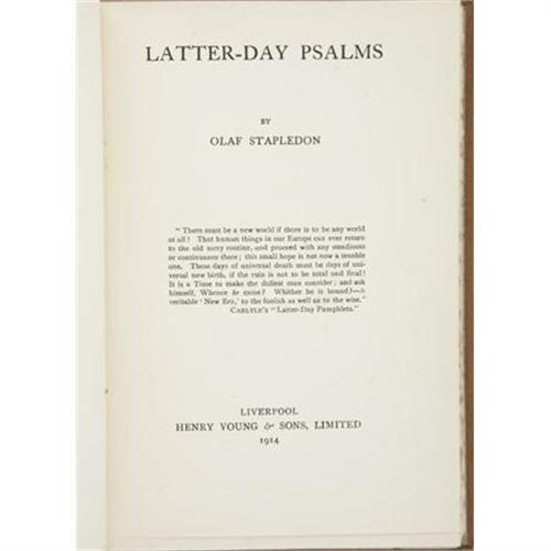 <B>Olaf Stapledon. </B></I><B><I>Latter-Day Psalms</B></I></B></I><B>.</B></I> Liverpool: Henry Young & Sons, Ltd., 1914.<BR> <BR>First edition. Twelvemo. 52 pages.<BR><BR>Publisher's brown cloth with gilt titles on the spine and gilt rules and titles on the front board. Corners bumped. Shelf wear at the extremities. Contents bright except the endpapers. Edges untrimmed. Very good. Perhaps the earliest published work by Stapledon written as the world poised on the brink of the First World War. A rare book. <I>From the Robert and Diane Yaspan Collection.</B></I><BR><BR><b>Shipping:</b> Books & Catalogs (<a target="_blank" href="http://www.heritageauctions.com/common/shipping.php">view shipping information</a>)