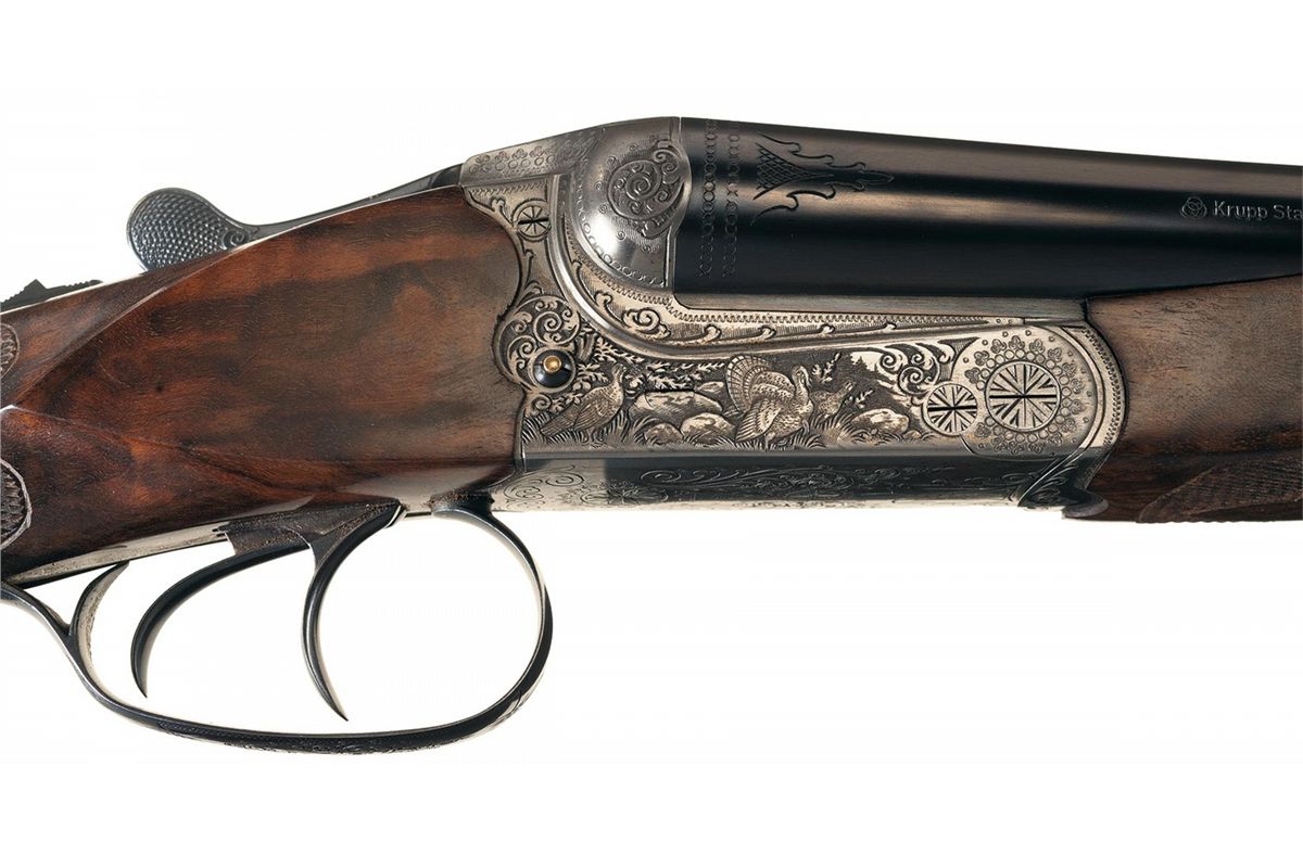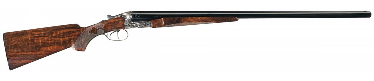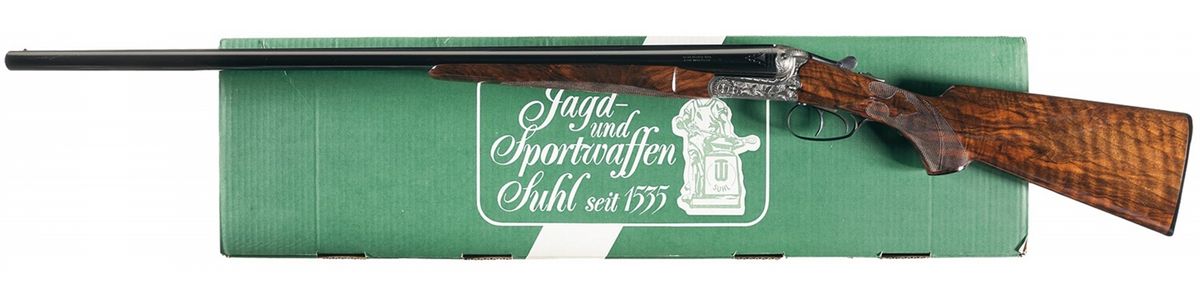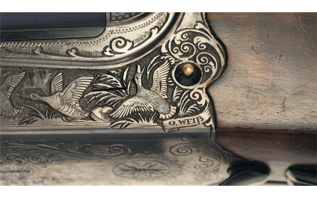 Manufactured in August of 2000. The receiver is engraved with floral scroll and punch dot designs with a game scene showing three ducks taking flight from a marsh on the left side and three turkeys on a rocky hillside on the right side. The bottom right corner on the left side of the receiver is signed by Olaf Weiss. The trigger guard, break lever, forearm hardware and sides of the barrels at the breech have flourishes of floral scroll engraving. The break lever has "EL" inlaid in silver. The barrels have a brass bead front sight, are choked improved cylinder/improved modified and has 3 inch chambers with long forcing cones and ejectors. Bores measures .729 and wall thickness is .044. Mounted on a nicely figured Fluer-de-Lis pattern checkered walnut forearm and pistol grip stock with a plastic grip cap and serrated plastic buttplate. Length of pull is 14 1/2 inches, drop at comb is 1 1/2 inches and drop at heel is 2 3/8 inches. With original box numbered to gun.