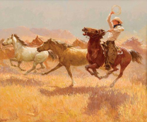 Olaf Wieghorst. (1899-1988). 20" x 24". Oil on Canvas. "Hazing the Herd". With 22k gold frame. Signed LL. (est $50,000-60,000).