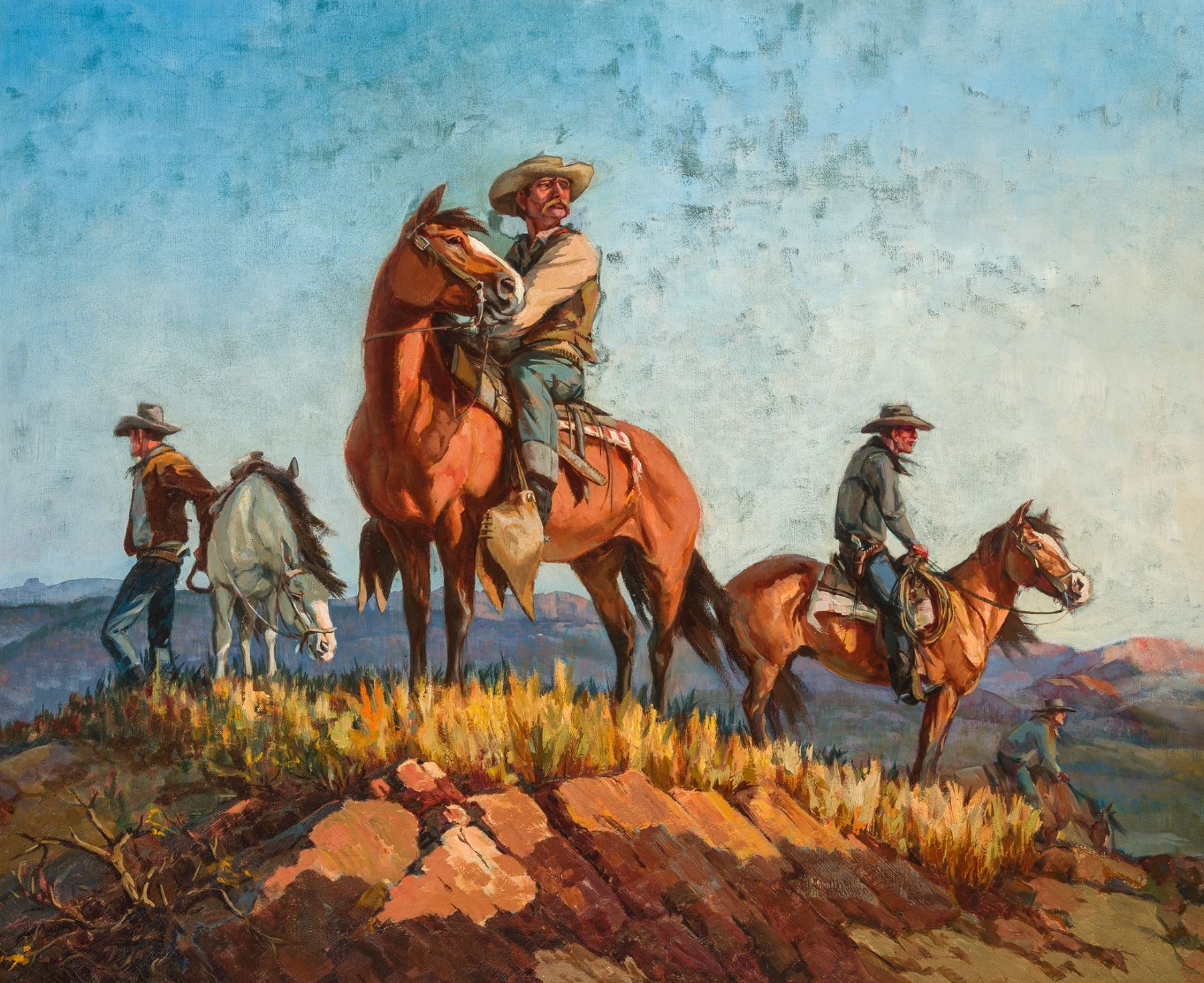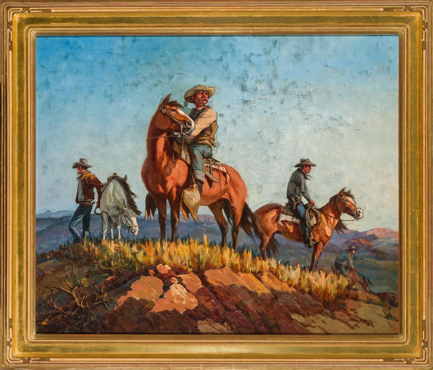 Condition details: This painting is in good condition. There is crazing present throughout the piece. There appears to be no loose pigments. Closer inspection under ultraviolet light reveals normal fluorescence of artist's pigments, and no signs of restoration. The piece is framed in a carved ornate gold frame. The frame is in very good condition with normal wear. Verso: Label: Mitchell Brown Fine Art, Inc., Santa Fe, New Mexico. Label: Altermann & Morris Galleries.
