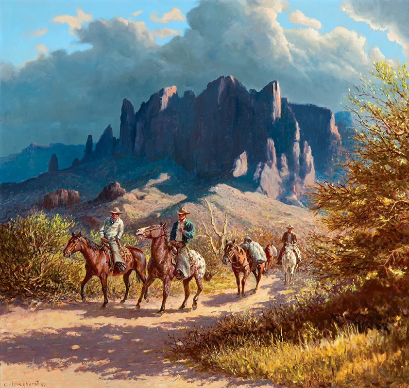 The Superstition Mountains rise out of the Arizona desert like a castle–King Arthur’s misty Avalon, perhaps. They reek with similar romance as the home of the Apache peoples and the peoples who preceded them, who are known as members of the Salado culture. Petroglyphs on the rock walls speak to the past, and legends, like that of the Lost Dutchman’s Mine–which claims imaginations and even lives to this day–give the place an air of enduring mystery. Wieghorst’s painting seems benign enough on the surface–the Superstitions were where he lived and worked, after all–but the men and horses packing out seem quietly relieved. There’s always a deep shadow somewhere on those mountains, and, as I intimated, you can get lost there, or lose yourself, or both.