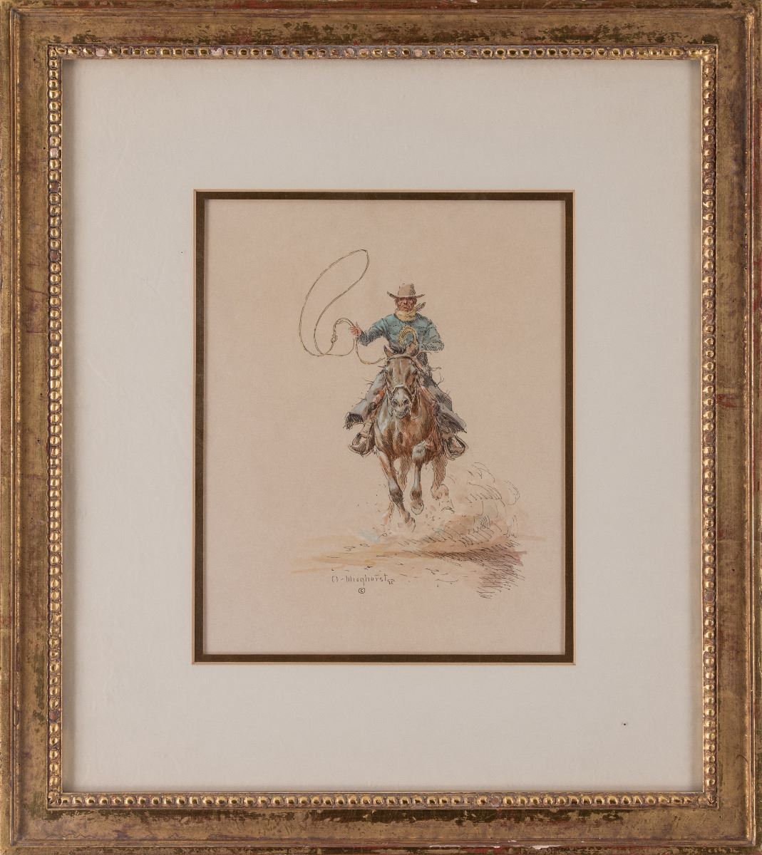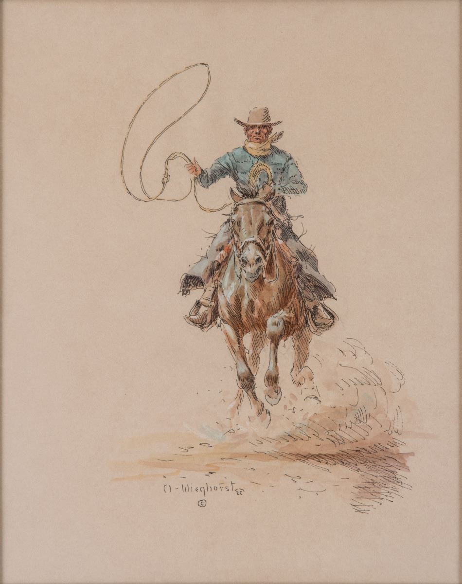Olaf Wieghorst (1899-1988). Roping Cowboy. 10" x 8" mixed media. Signed lower center.