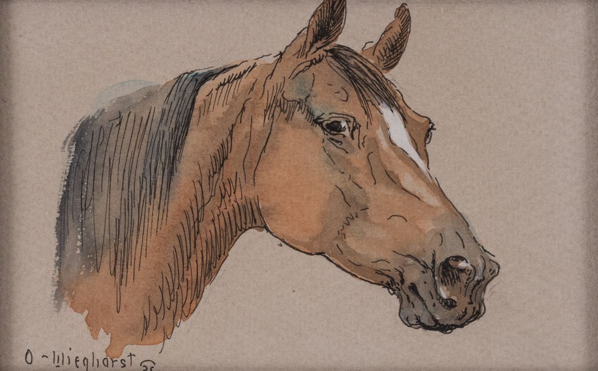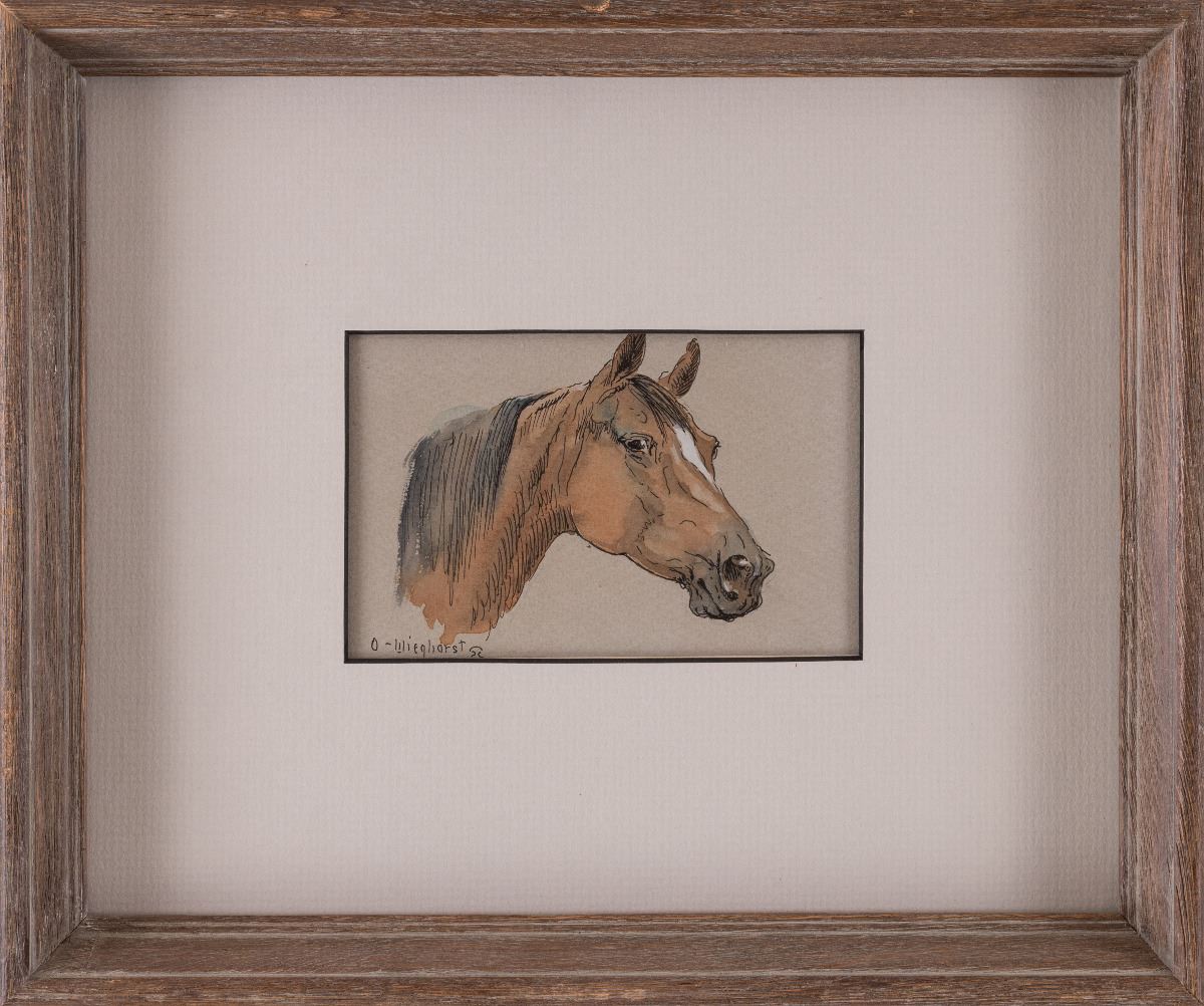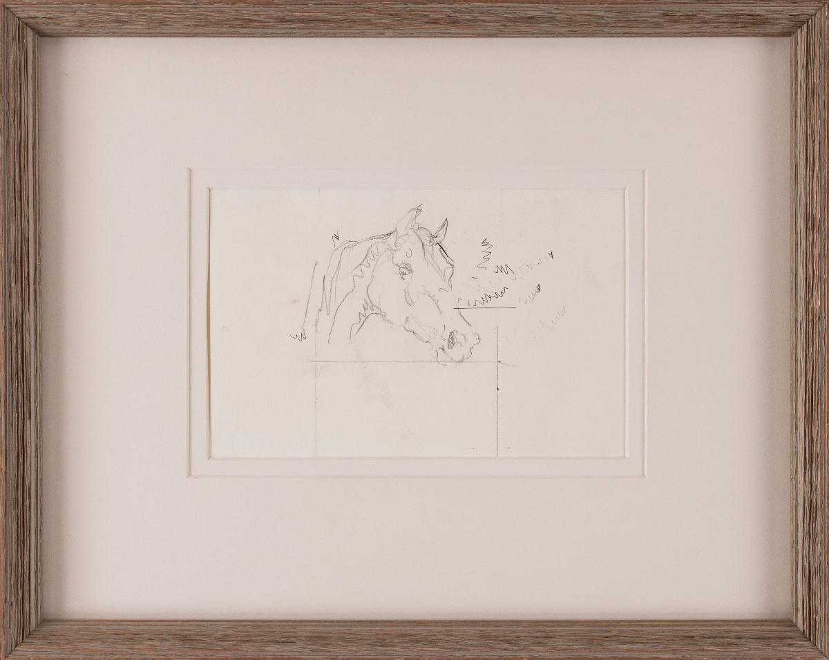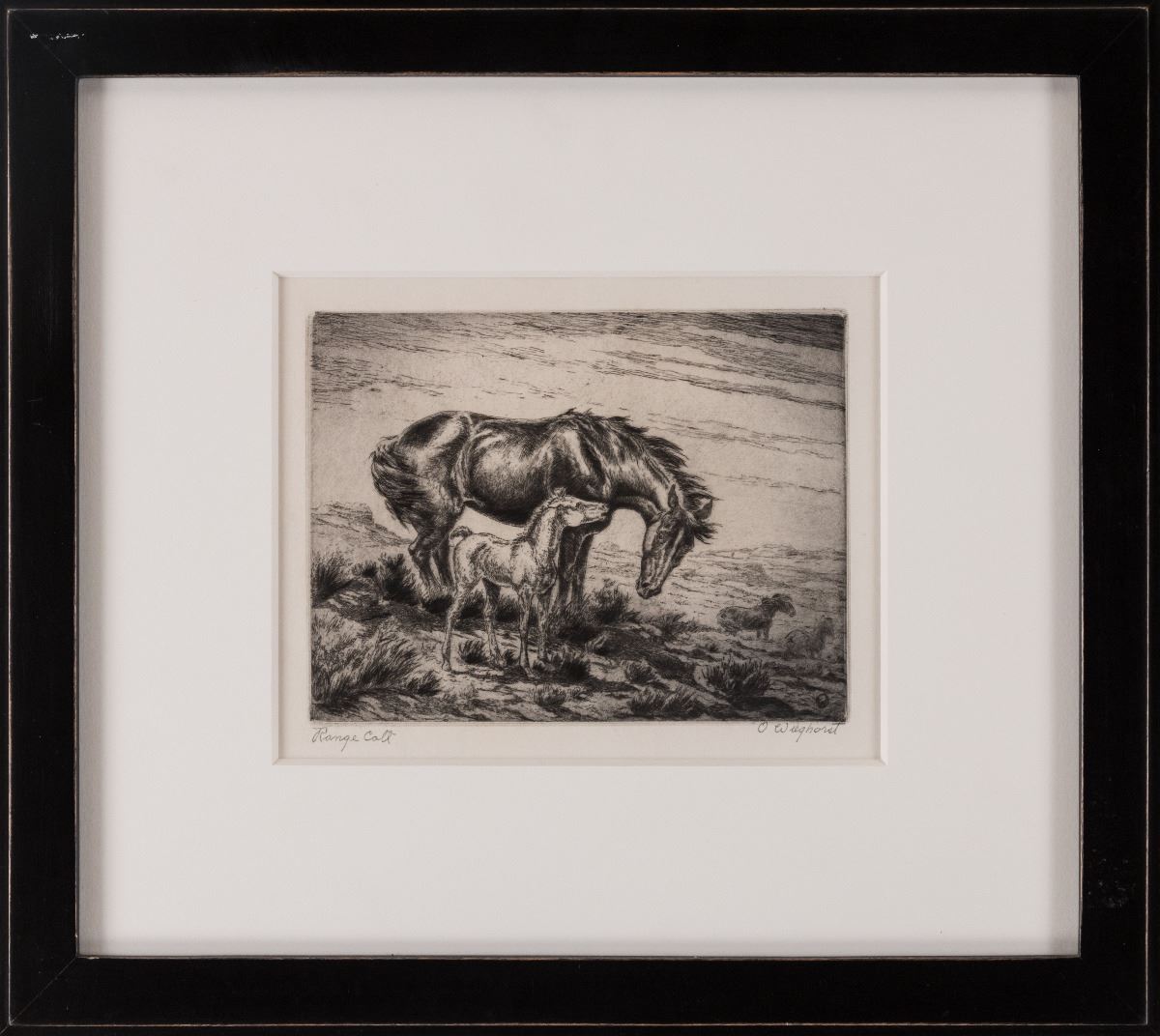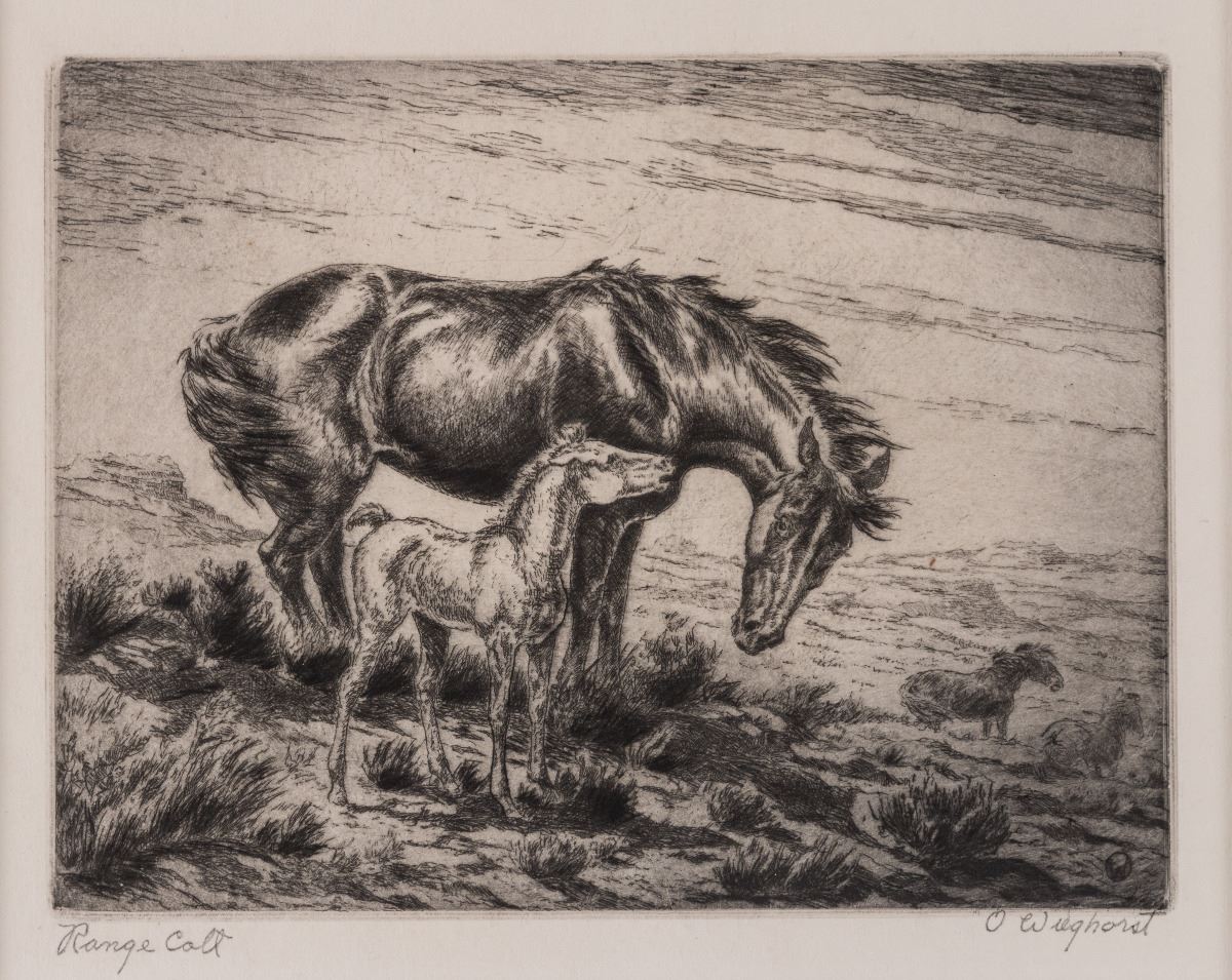 1) Range Colt. 5 ¾" x 7 ½" etching. Signed lower right, titled lower left. 2) Horse Head Sketch. 5 ½" x 8 ½" graphite and ink. Unsigned. 3) Homemade Card. 4" x 6" mixed media postcard. Signed lower left. Verso: Post stamped January 24, 1963. "Friend Dick and Clara, Thank you for the Johnson County Sheriff card- we expect to be in Arizona first part of Feb., Mae & Olaf"