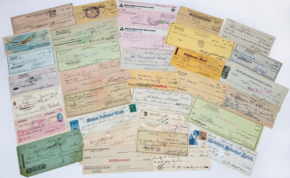 Large collection of approx. 19,000+ signed checks from various historical and entertainment personalities from the collection of renowned collector Olan D. Chiles. The collection spans heads of state, financiers and business, American and Canadian wrestling, baseball and football players, actors and actresses, musicians and composers, writers, etc. Some of the highlights include: 220+ checks signed by Wizard of Oz Munchkins including Jerry Maren, Margaret Pellegrini, Meinhardt Raabe and others, approx. 80 checks signed by WWI and WWII British, German and American Generals and Commanders, Bud Abbott and Lou Costello, Roscoe “Fatty” Arbuckle, The Beach Boys: Brian Wilson and Michael Love, The Beatles: George Harrison and Ringo Starr, Gen. P.G.T. Beauregard, John Belushi, Richard Burton, Edgar Rice Burroughs, Adm. Richard E. Byrd, Eddie Cantor TLS, Charles Carroll (signer of Declaration of Independence), James Fenimore Cooper, Porfirio Díaz, Charles Dickens, three signed Edison Phonograph Works/Thomas Edison, Inc. checks, Errol Flynn, Clark Gable, D.W. Griffiths, Jack Haley “The Tin Man,” Pres. Benjamin Harrison, Alfred Hitchcock, Herbert Hoover, Shemp Howard, Stan Laurel and Oliver Hardy, Jack London, Walter Kent, Lloyd, Marx Brothers: Groucho, Harpo and Zeppo Marx, Tom Mix, Adm. Robert E. Peary, Rat Pack: Frank Sinatra, Sammy Davis, Jr. and Dean Martin, Robert Redford, Ringling Bros. Barnum & Bailey Circus: James A. Bailey, Al Ringling, Charles Ringling, Henry Ringling, Rosalind Russell, Sir Walter Scott, Rod Serling, George Bernard Shaw, approx. 250 checks signed by Count Laszlo Szechenyi, husband of Gladys Vanderbilt, Gen. Winfield Scott, Mack Sennett, Jay Silverheels, Norman Tyler Sobel, John Philip Sousa, Three Stooges (Moe Howard, Jo DeRita, Larry Fine), Adolph Sutro, Alfred, Lord Tennyson, approx. 120 Muriel Vanderbilt signed checks dated Aug. 12, 1922-June 3, 1923, Orson Welles, Sir Arthur Wellesley Wellington, Flo Ziegfeld, and many others. Notably, there are approx. 14,000+ Rudy Vallee signed checks dated primarily from the 1930s and 1940s. Interested bidders are strongly encouraged to view this material in person.
