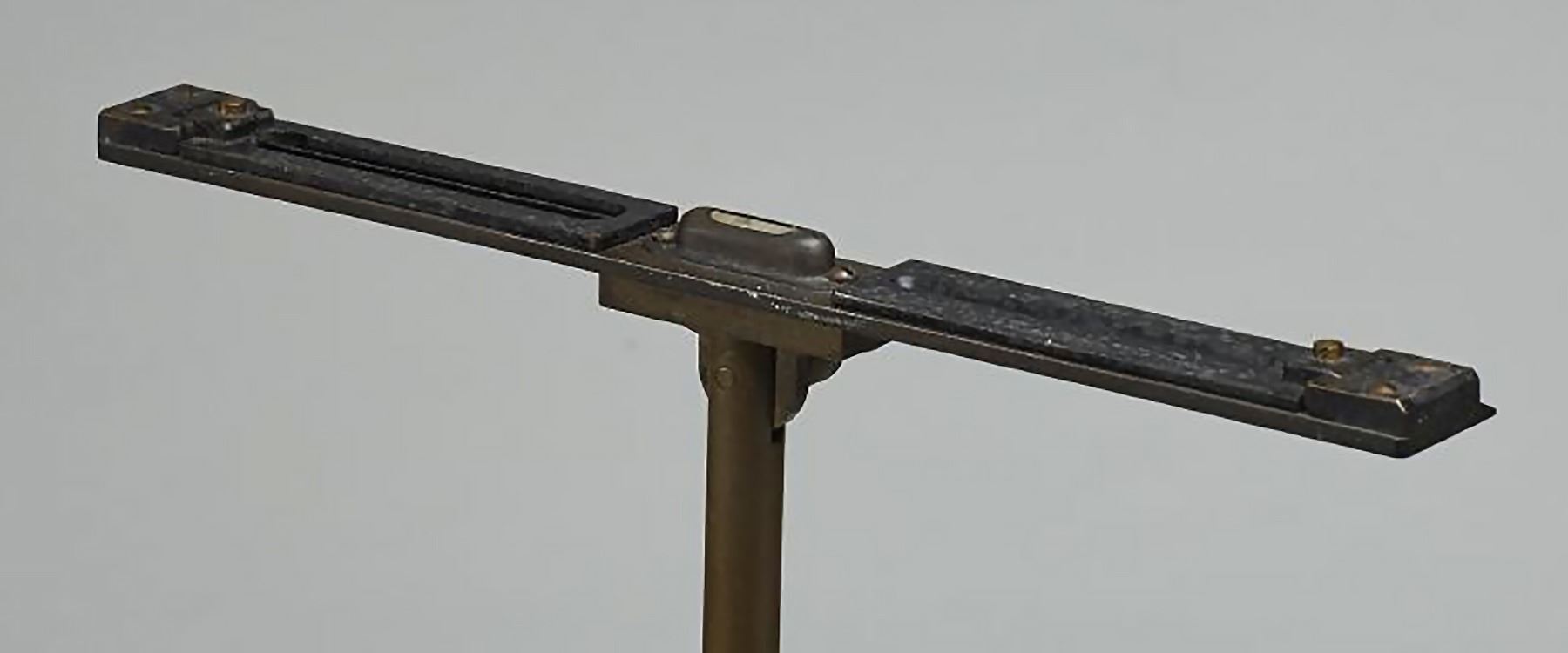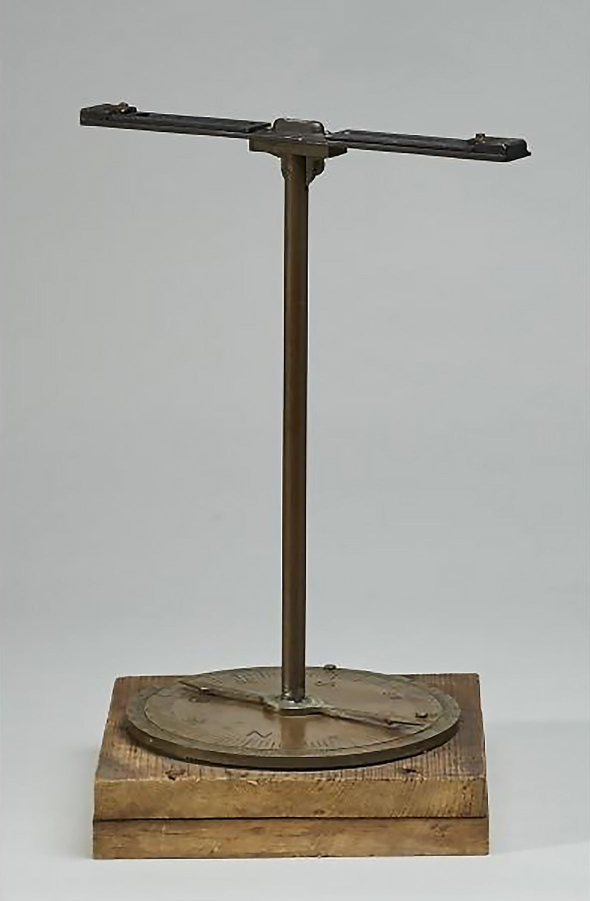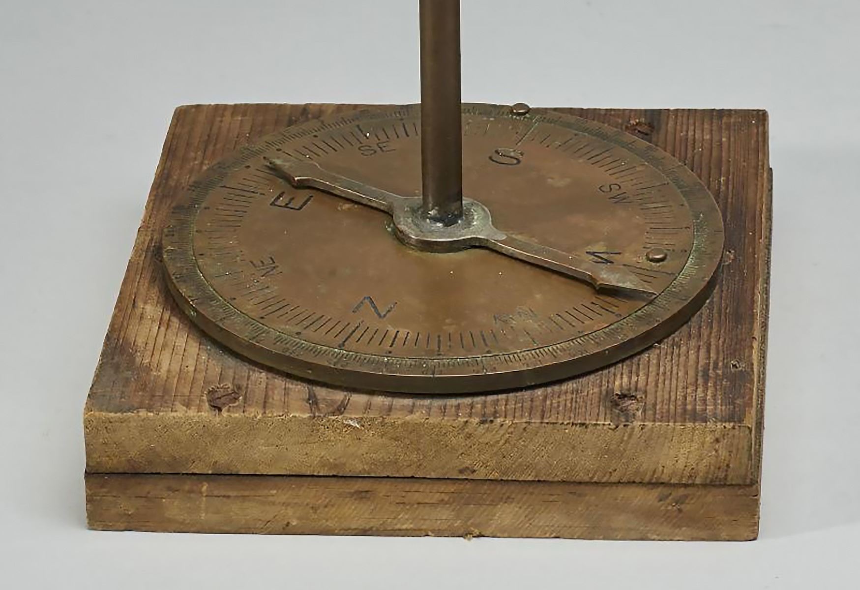 Old 19C Brass Compass Level Instrument. The 19th century scientific instrument compass level, measures 15 inches high. Mounted on a homemade square wooden base.