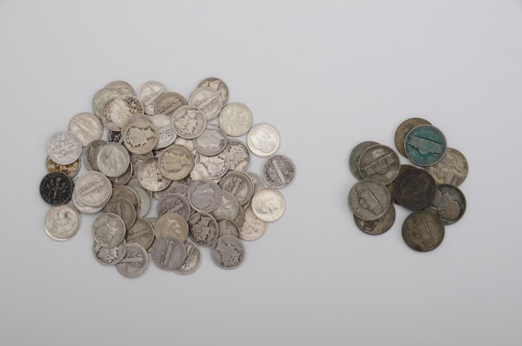 Old 82 US silver dimes and 11 silver war Nichols(1942-1945) with list with dates attached Est.:$500-$550