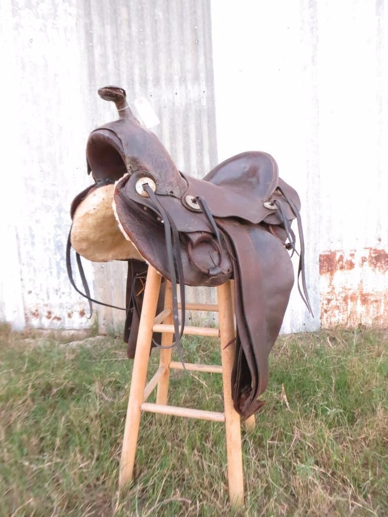 Border stamped. The skirt corners have been trimmed round. Iron rigging rings. Fair pad. No stirrups. 15" seat