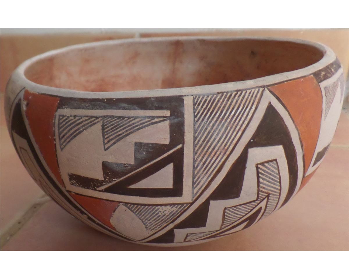 Old Acoma Bowl from the 1920's. The clay and paint item measures 7 x 5 inches. It has been broken and glued and possibly some repaint. Shipping $20.00
