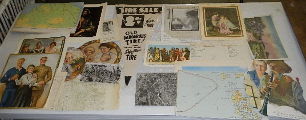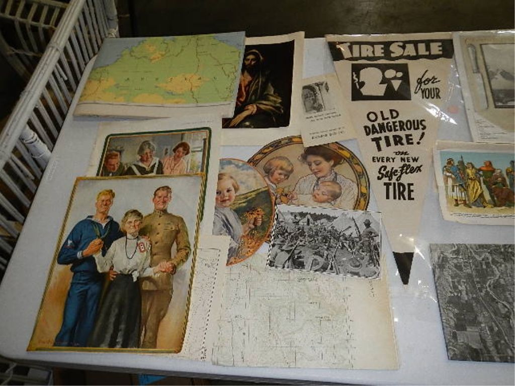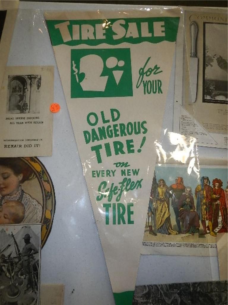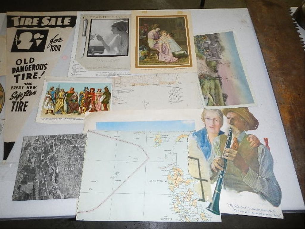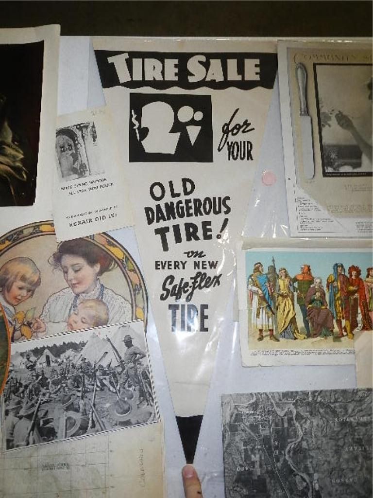 Old Advertisement Collection This is a box full of paper advertisements including 2 pennant shaped paper tire advertisements.