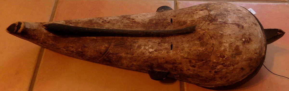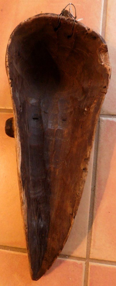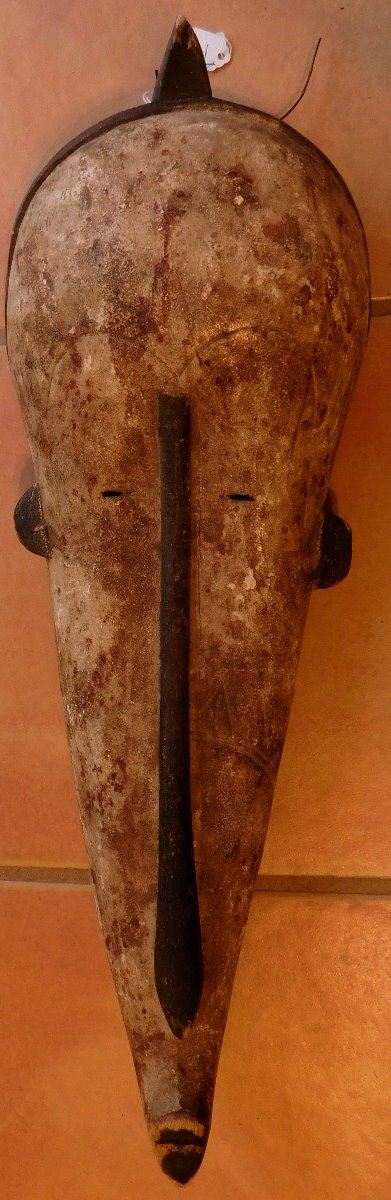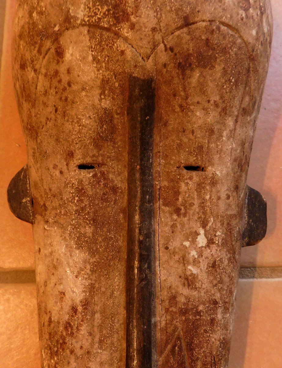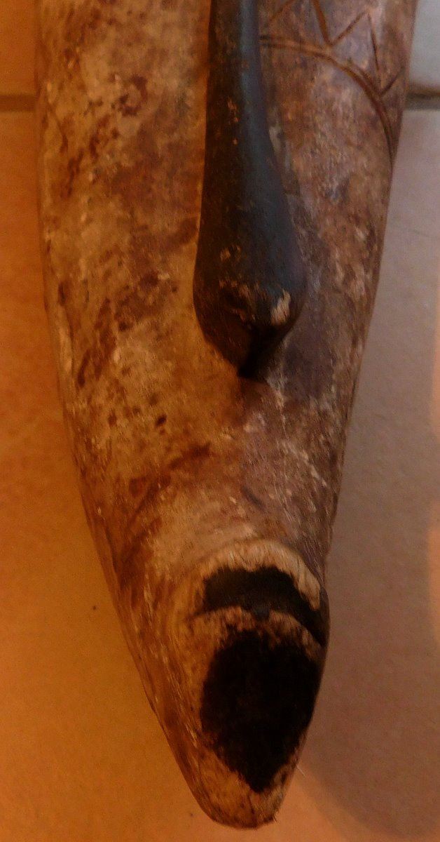 Old African Mask, circa 1940s. Made of wood and paint, the item is 22" x 7.5" x 5". Nigeria. Nice carving, good patina. Condition: Good, see images. Shipping: $45.00 due to length, w/insurance and signature.