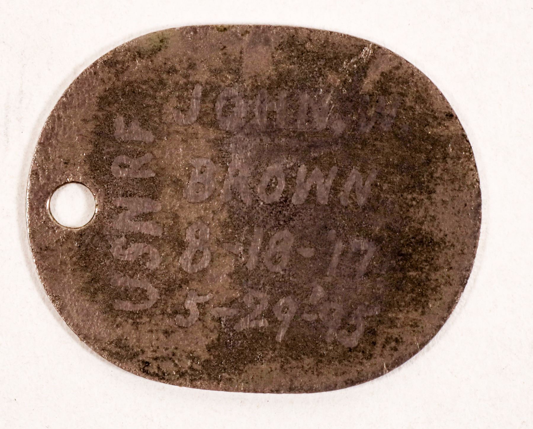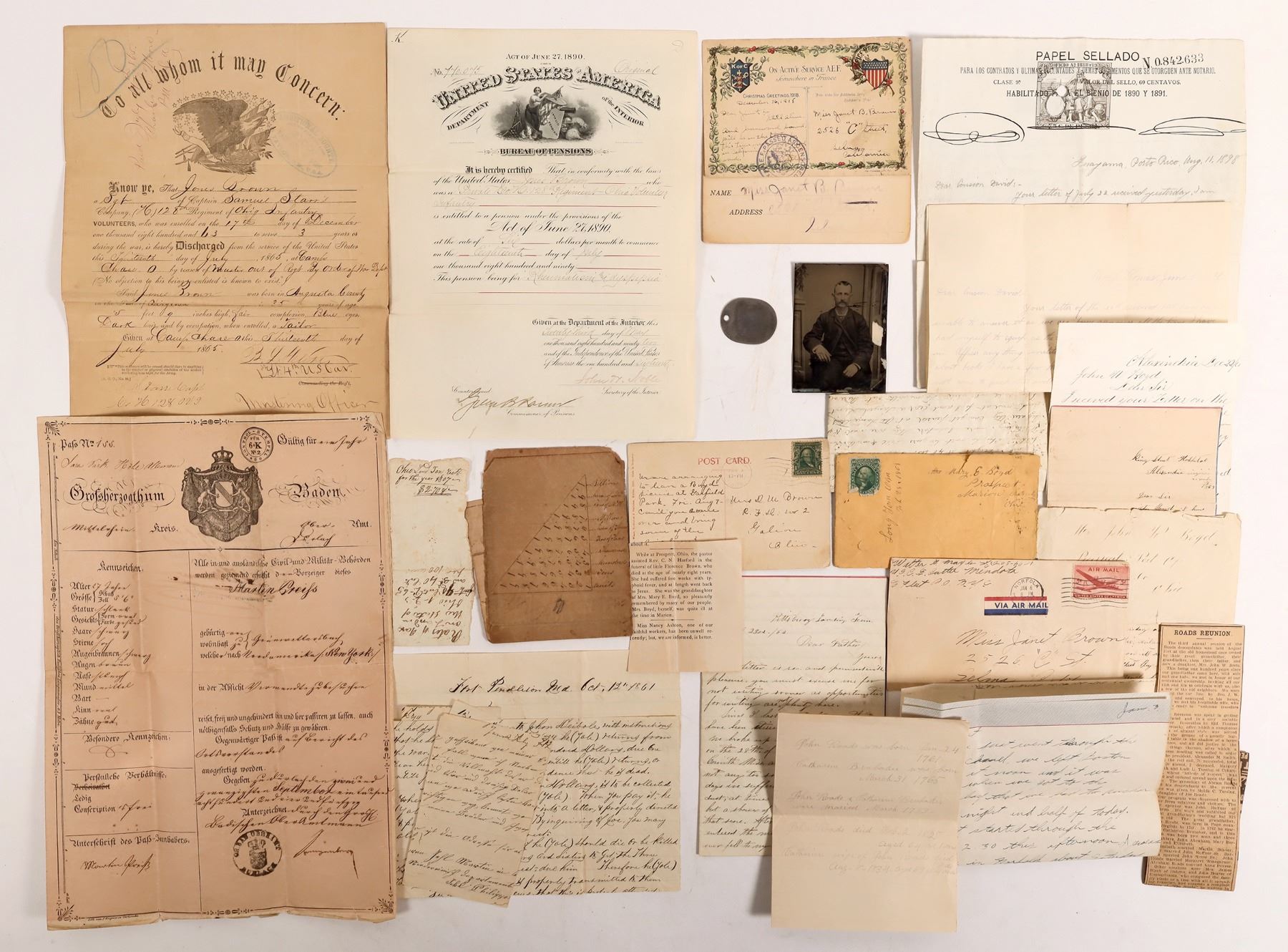 Sgt. Jones Brown from Columbus, Ohio, pension certificate 1892, and discharge document 1865. 1863 cover and letter-condition issues on letter. 1908 Marion Ohio unit postcard. 3.25x2.5" male tintype. Oval white metal John W. Brown US Navy dog tag? 8-18-17/5-29-95 with fingerprint on back. 2 1863 letters to John Boyd regarding receipt of $70 and another financial deal. 1862 letter from a soldier regarding his units activities by JW Roads. 1898 Porto Rico Expedition letter "the bullets went over our heads" and more battle details and another letter ""the government does nor furnish a Commission Officer any thing military equipment..I am about broke." 1854 German passport style papers of Martin Creiss from Germany to New York, stamped in Belgium and France on page 2. 1918 WW1 postcards from a soldier to his family in Selma, CA "Still Alive". Hand written 1847 match table written by Mary Roads.
