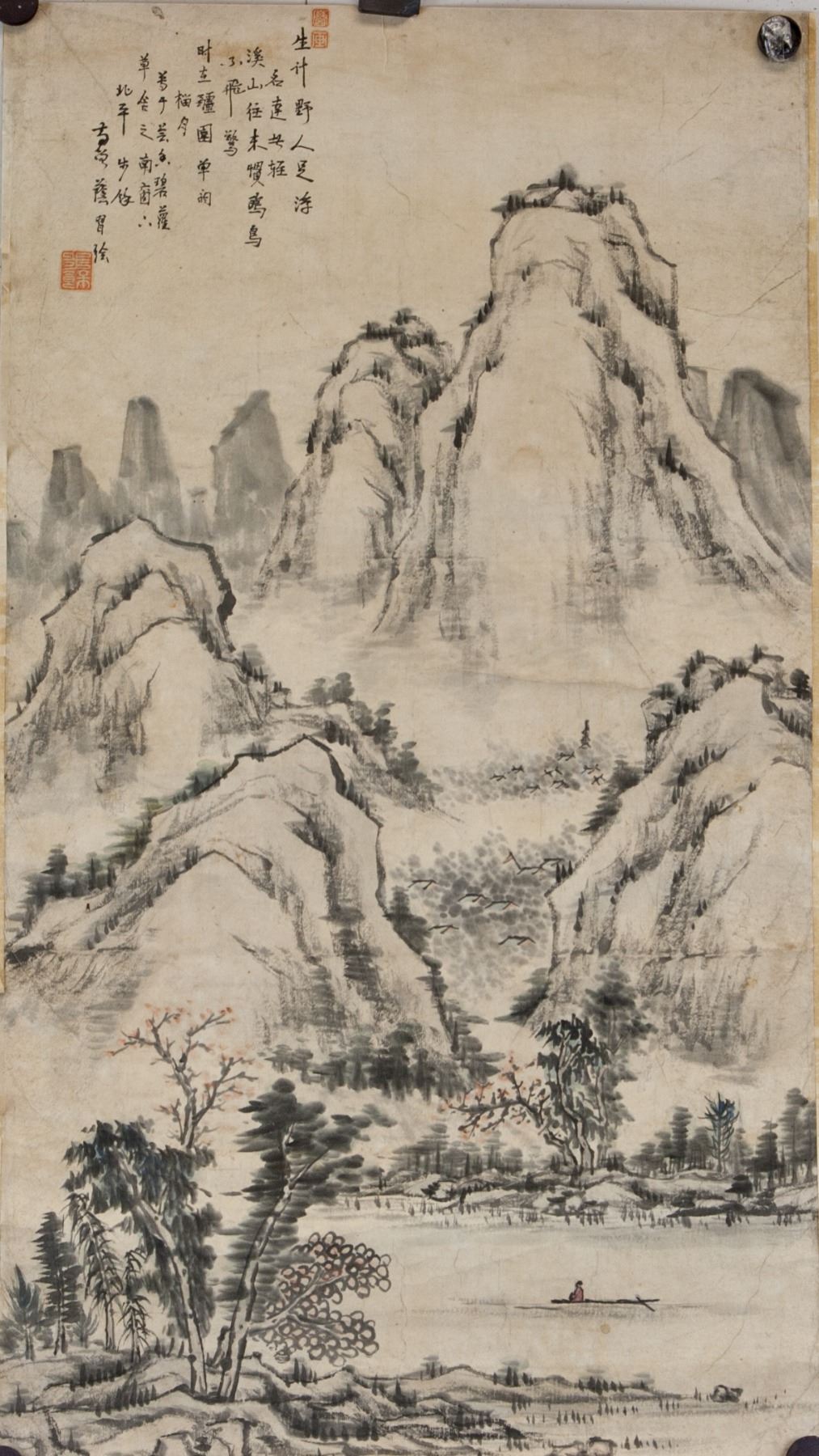 Ink and watercolor on paper roll. Featuring mountainous landscape. Signed by artist, probably Japanese artist; inscribed with 3 artist seals; 58 cm x 33 cm; Fair condition; yellowing paper. few fold marks, ripped edges.