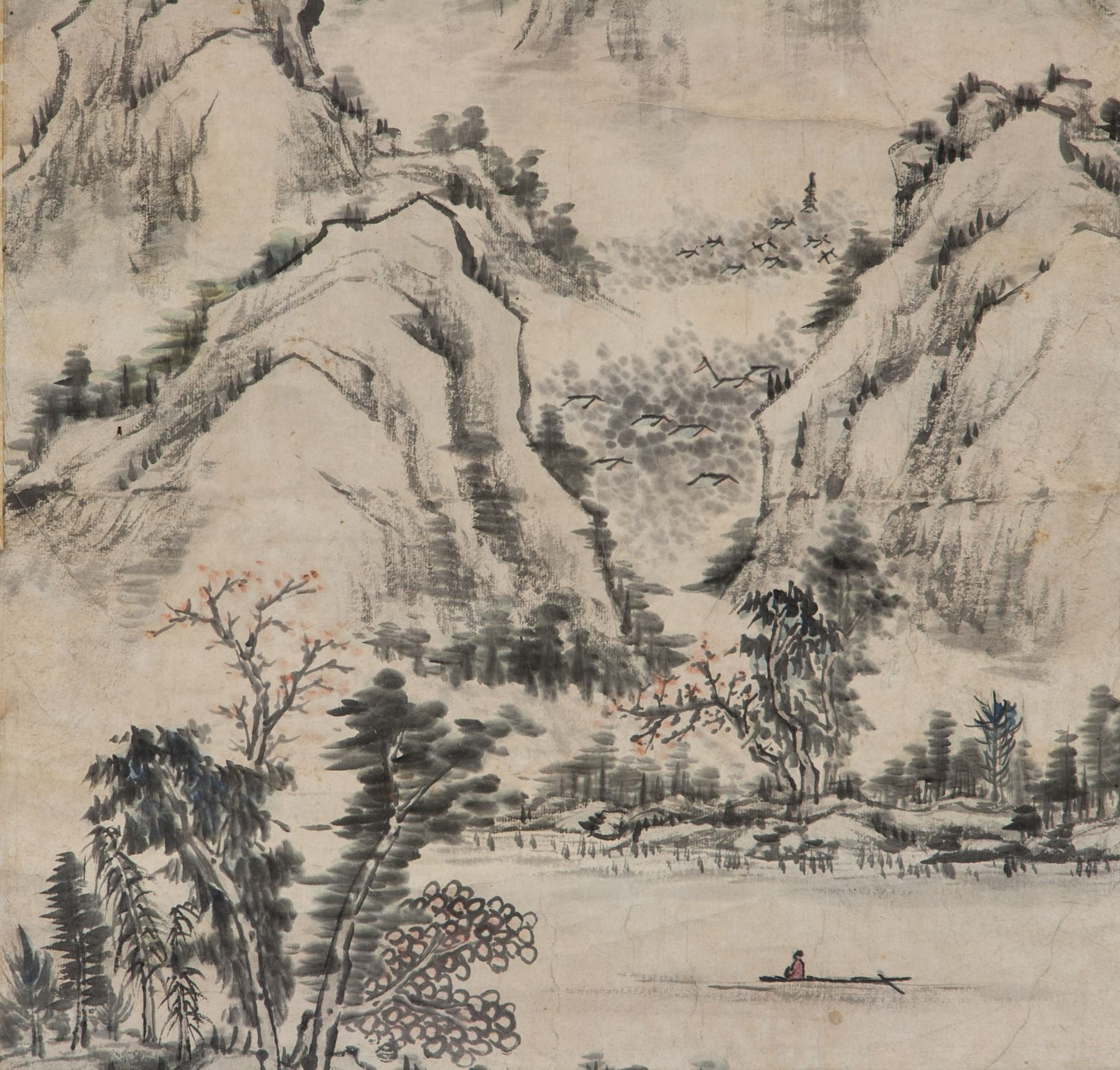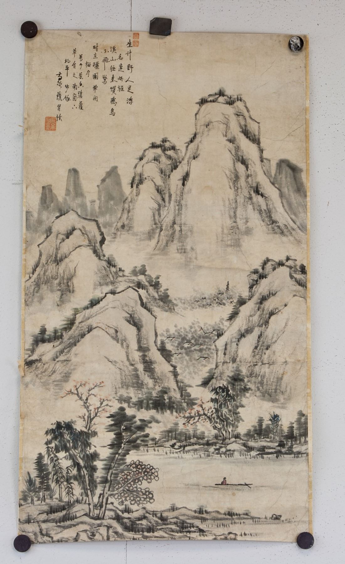 Mountainous landscape; Chinese ink and watercolour on paper roll; signed by artist, probably Japanese artist; inscribed with 3 artist seals; 58 cm x 33 cm; Fair condition; yellowing paper. few fold marks, ripped edges. PROVENANCE: Private Japanese-American collection, acquired by present owner shortly after passing of previous owner