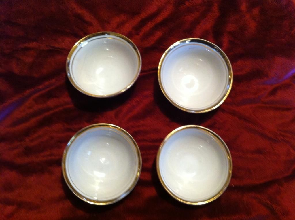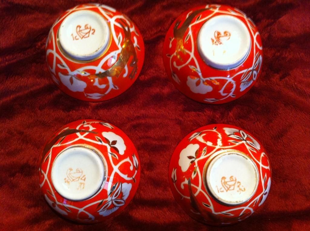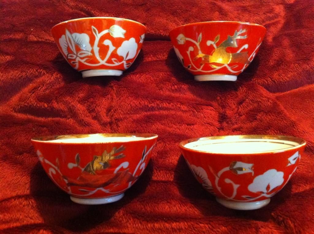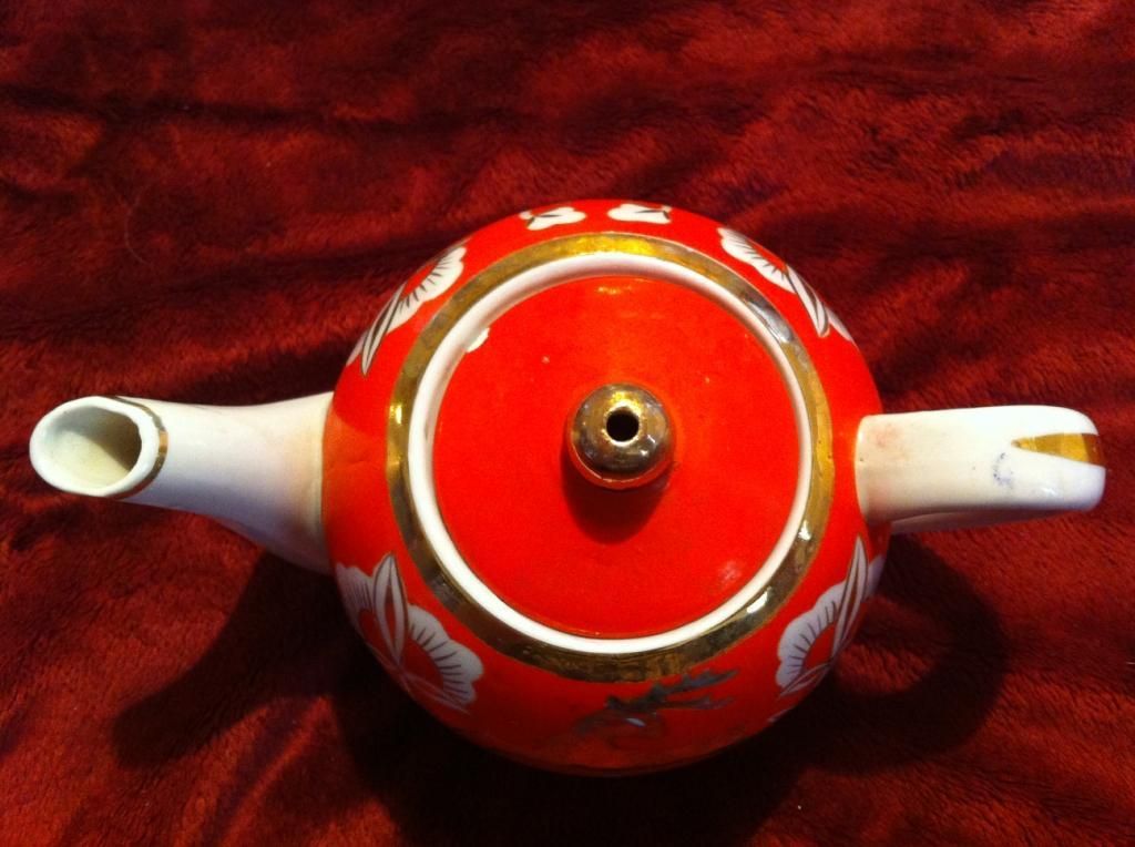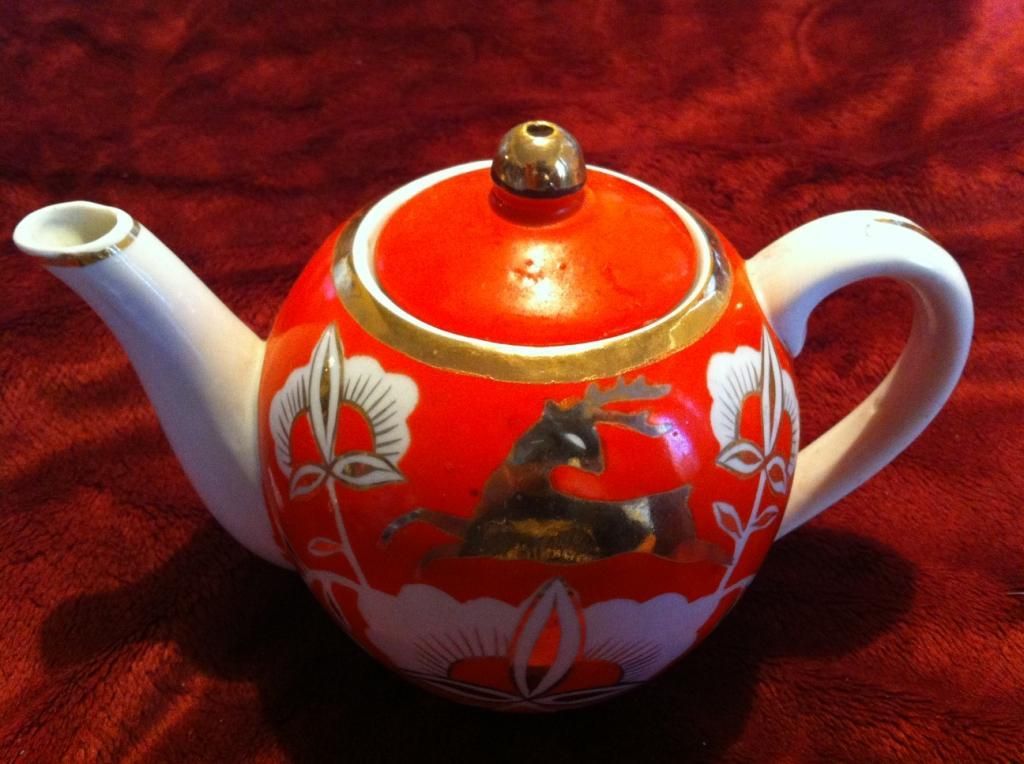 Old Asian Ceramic Teapot with 4 cups has an orange background and white vine's with gold accents pattern flowing throughout the pieces and a gold deer running across. All pieces are trimmed in gold . The teacup measures approximately 4" diameter and the base is 1 5/8" diameter. The teapot measures 7" from tip of spout to end of handle.